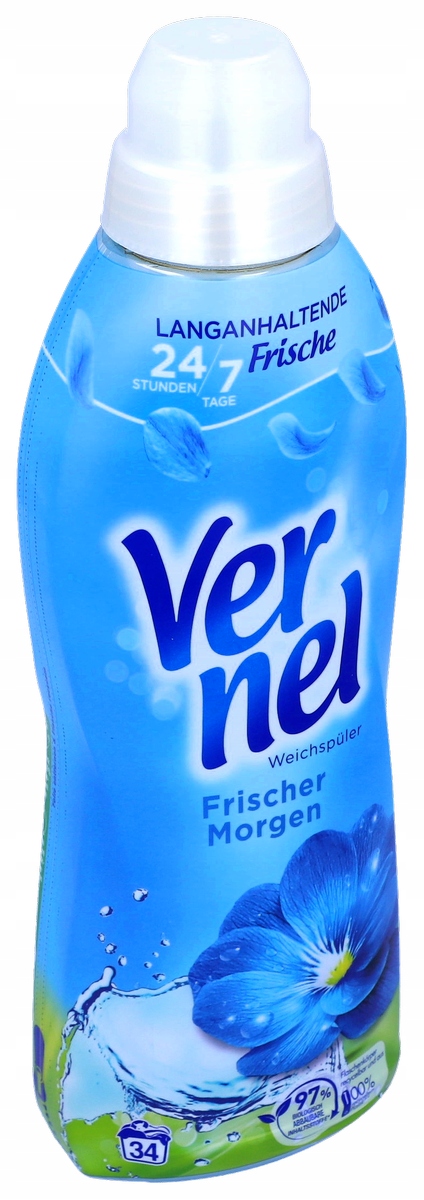 Пом'якшувач білизни Frischer Morgen Vernel побалує вас своїм ароматом, а завдяки унікальній технології віддушки діє до 7 днів. Формула парфумів для прання дерматологічно підтверджена та зменшує електростатичні заряди.