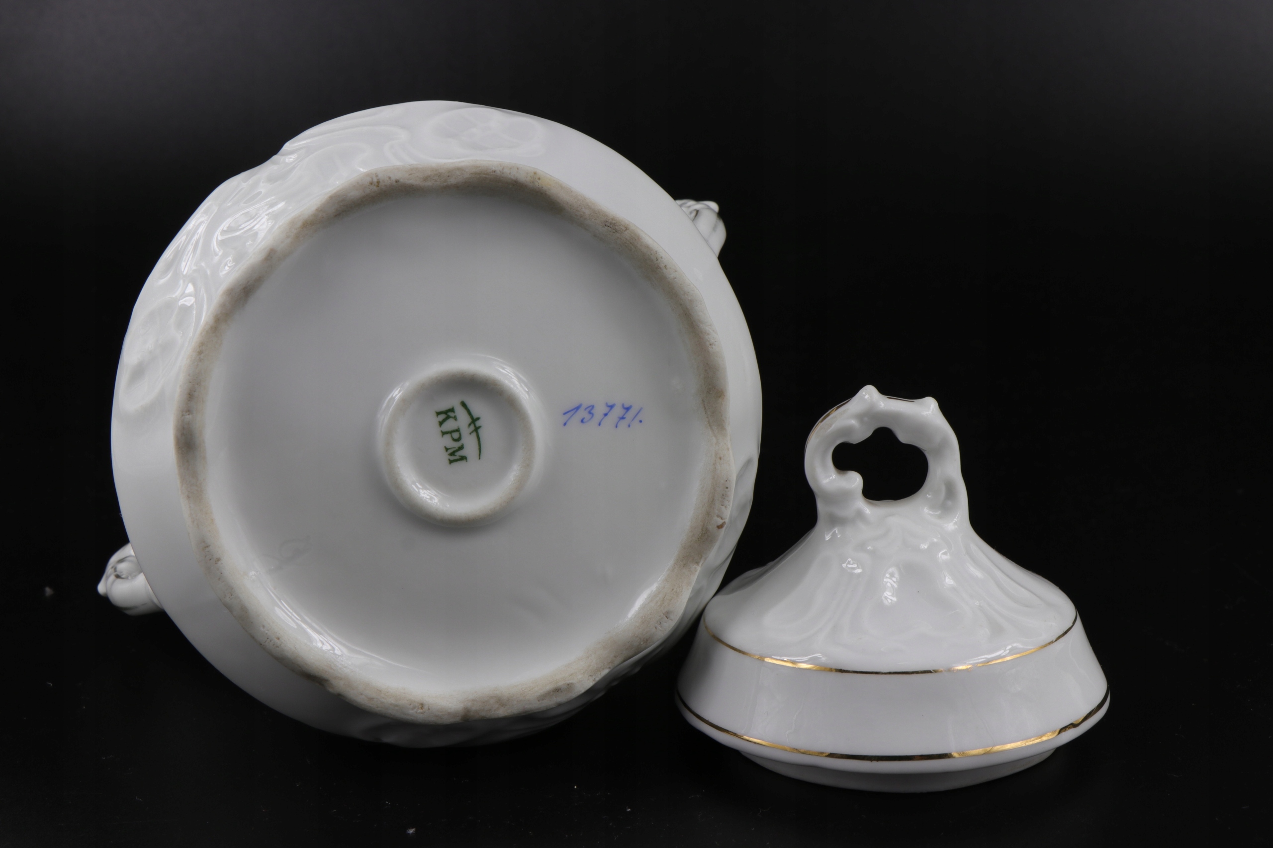 порцелянова цукорниця від KPM Wałbrzych приблизно 1900 року. Декорація порцеляни красивим рельєфом у стилі модерн та орнаментом ірисів, зробленим за допомогою кальки.