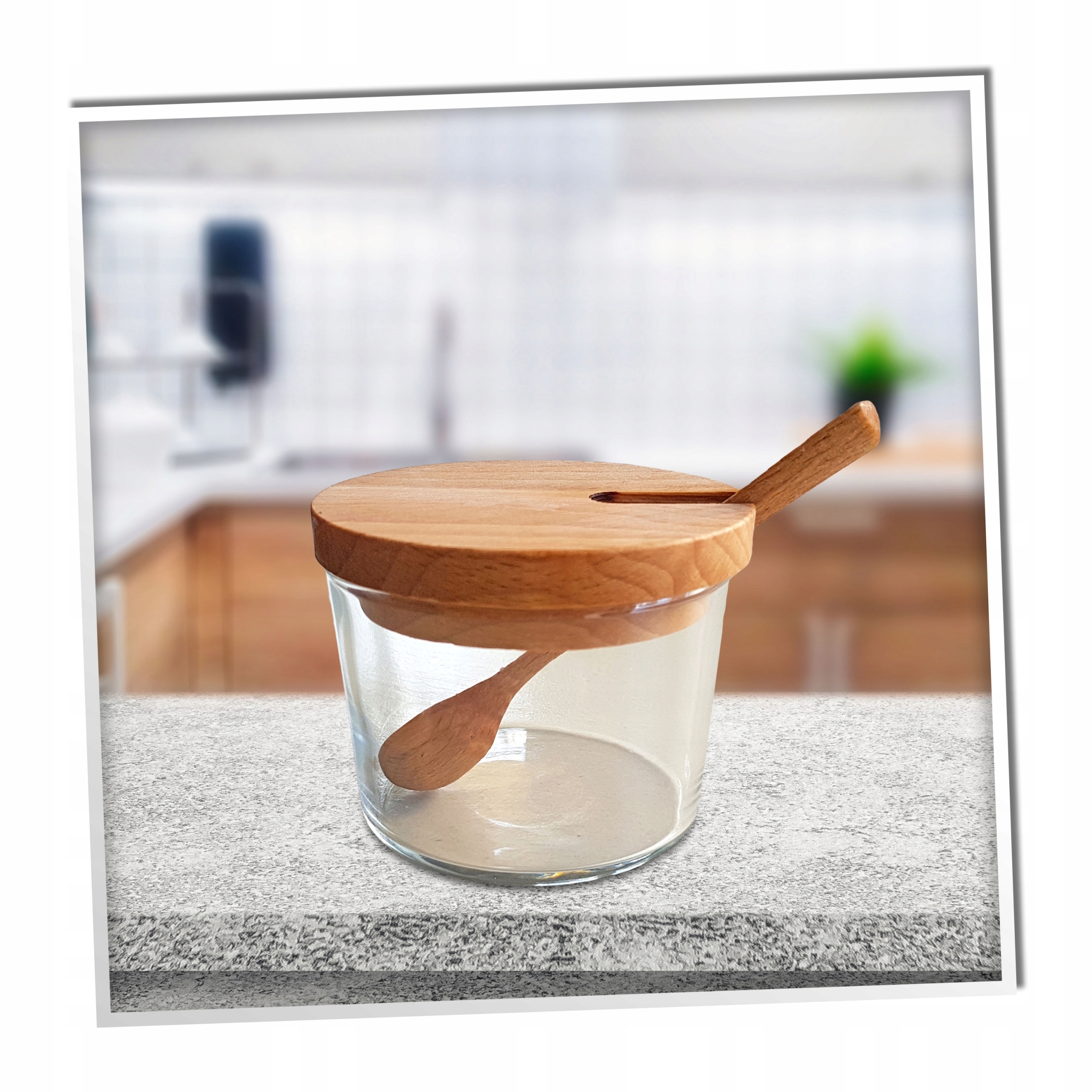 Цукорниця зі скла з кришкою та ложкою з високоякісної деревини бука.