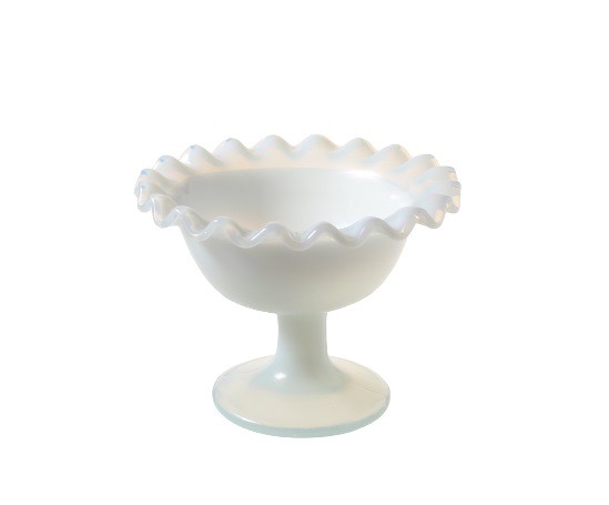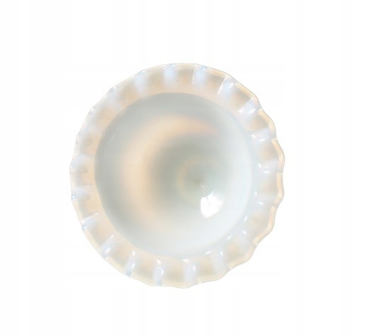Цукорниця з молочного тонованого пресованого скла. Край чаші оброблений характерним воланом. Цукорниця, ймовірно, походить із Зомбковіцького скляного заводу в Домброві-Гурнічі. 2 половина 20 століття