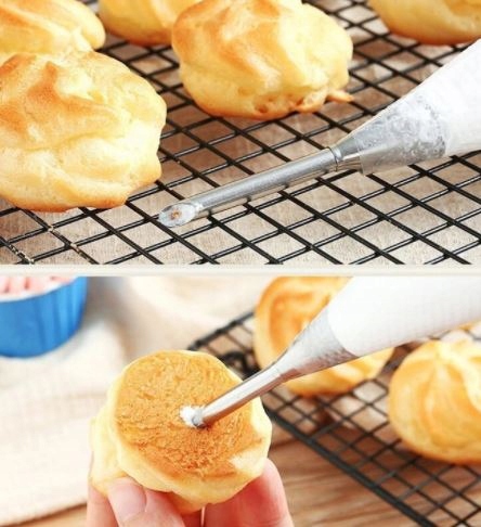 Дуже простий у використанні, все, що вам потрібно, - це кондитерський рукав та начинка, наповнення пончиків, трубки та інші хлібобулочні вироби.