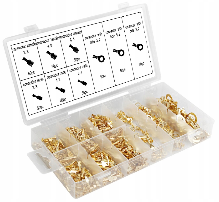 Кабельні з’єднувачі в міцній пластиковій упаковці, відсортовані за розміром в окремих відділеннях.