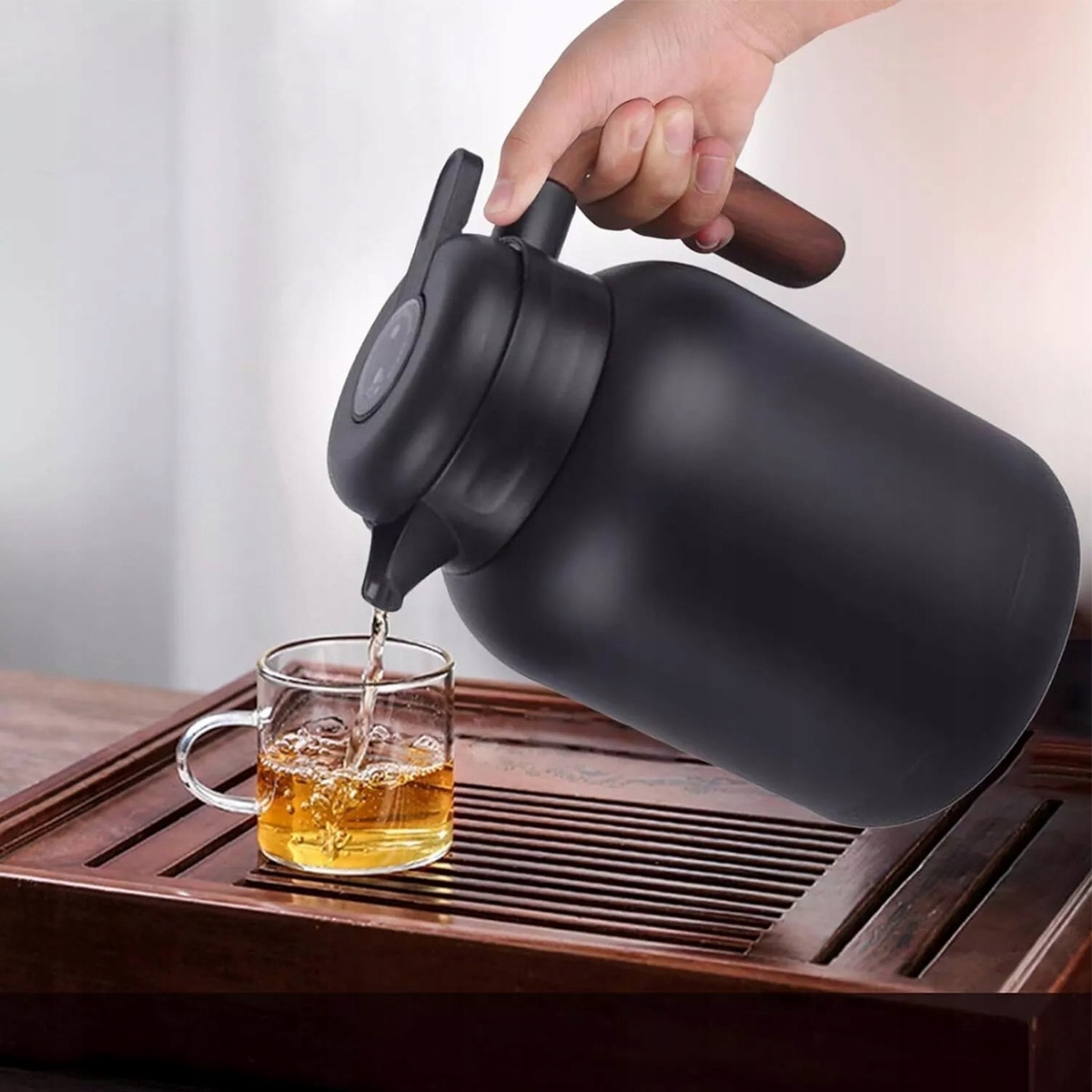 Термос потужністю 1,5 літра, кава, виготовлена з подвійної нержавіючої сталі та температури BPA, чайної термосу з знімною смугою та температурою та температурою Ручка з зерна з дерева