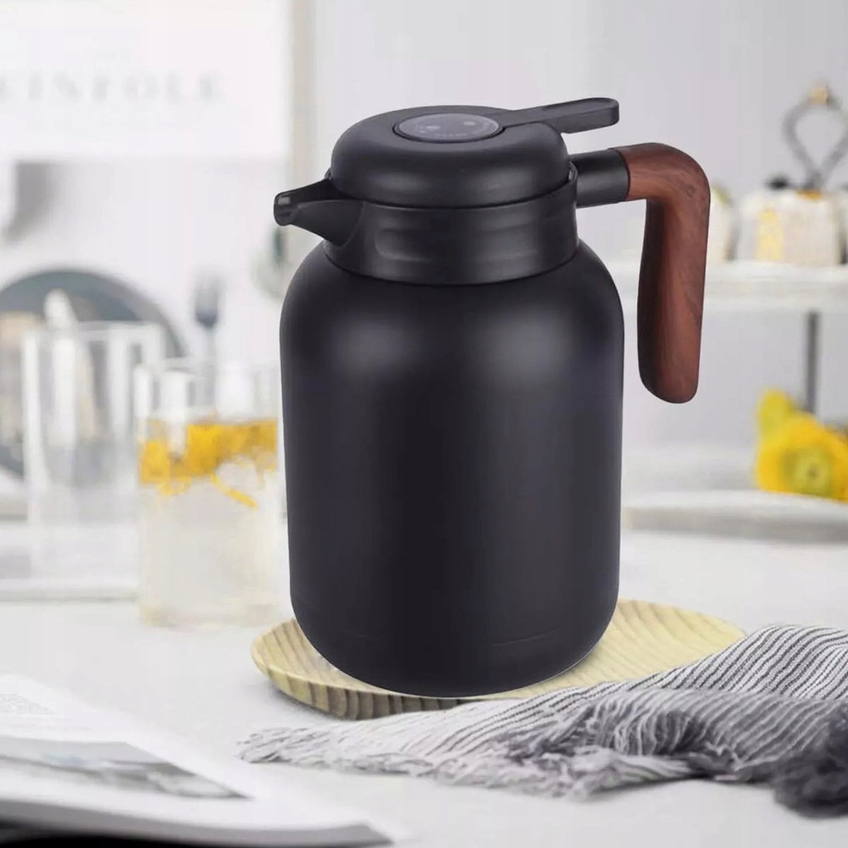 ➡ 【Матеріали високої якості】 Вакуумний глечик має внутрішній контейнер, виготовлений з 316 нержавіючої сталі з нержавіючої сталі, яка є ще більш міцною та екологічною. Це забезпечує здоров'я, безпеку та тривалий смак та свіжість напоїв. Зовнішнє покриття завершено матовим чорним покриттям з нержавіючої сталі, що є міцним і стійким до іржі. Кришка виготовлена з PP + водонепроникного силіконового кільця, 100% без BPA, для захисту здоров'я. Приваблива пластикова зернова ручка забезпечує зручне зчеплення і більш міцна, ніж деревина. години. Зовнішнє покриття термос також є термічно ізольованим, тому немає ризику спалити руки при виливанні гарячих рідин. Ємність 1,5 літра дозволяє легко готувати 8 чашок кави або інших гарячих та холодних напоїв - ідеально підходить як тепловий глечик, чайник або кавовий глечик. виникають при низькій температурі рідини). ПРИМІТКА: Кришка не повинна вставляти в окроп або стерилізувати при високих температурах, інакше електронні компоненти всередині будуть пошкоджені! Безпечна кришка для чаю або кави сильно прикріплена до силіконового ущільнювального кільця і суворо з'єднана з ізоляційним теплом, герметичною конструкцією. Навіть після того, як перевернути догори дном, жодна крапля не просочиться. Важіль на кришці полегшує наливання чаю або кави однією рукою. Вигнутий носор у формі U забезпечує точну розливу без капання. Термос оснащений силіконовою основою, що не має слизу, на дні, яка забезпечує стабільність і запобігає перекиданням, підтримуючи чистоту поверхню столу, ідеально підходить для їдальні чи офісу. Легко (тільки вручне миття, ви не можете мити в посудомийній машині). Знімний чайний фільтр збирає чайні листя, завдяки якому чисткам ще простіше.