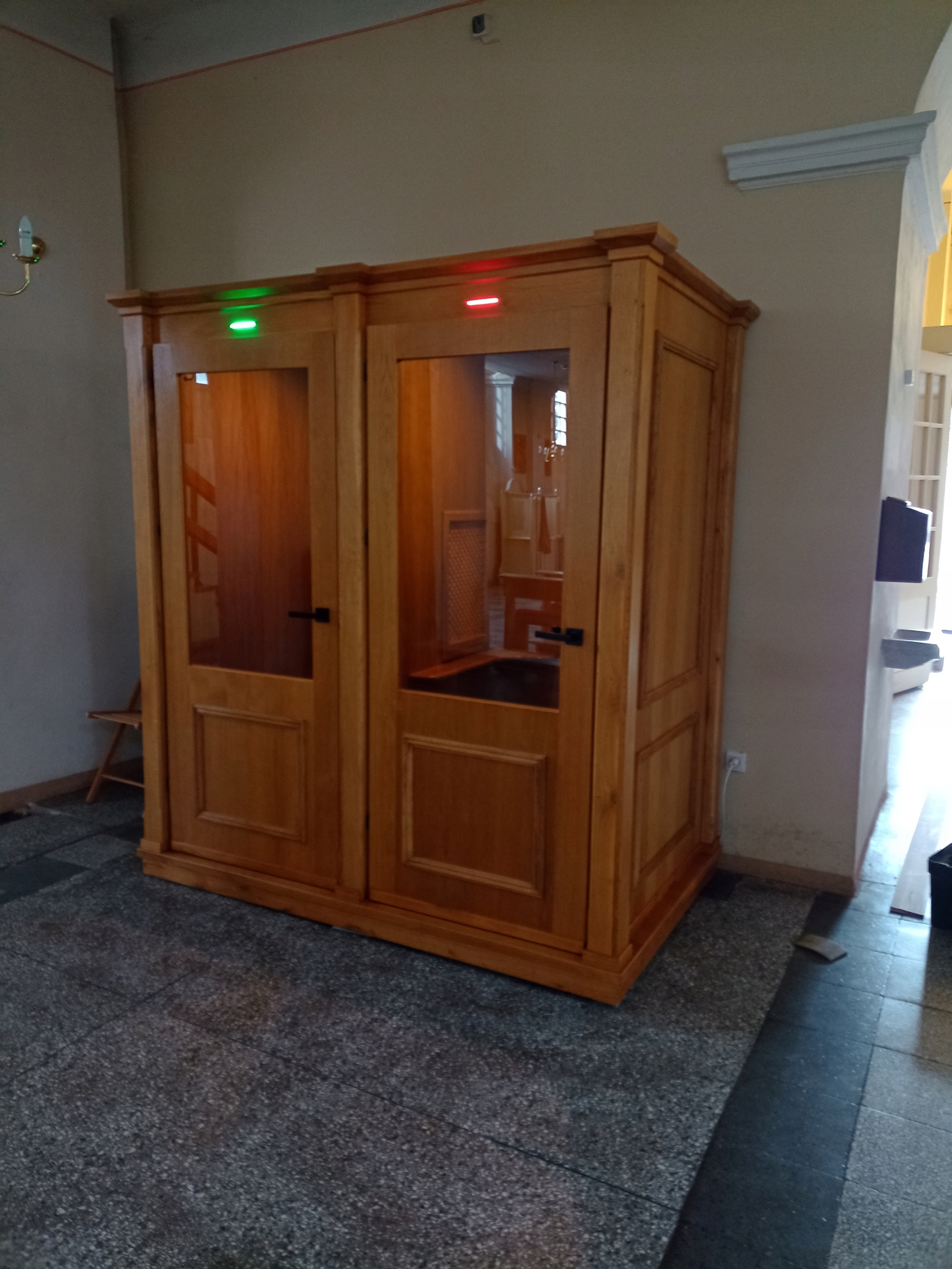 У нас є закрита, один -аналогічний сповідик. Він оснащений вентиляцією, освітленням і для додаткової оплати також може бути оснащена нагрітою оббивкою. Сигналізація над дверима повідомляє про наявність священика та покаяння. Зроблено з дубового дерева. Пропозиція спрямована на людей та місця, де призначена меблі. Ми не продаємо свої меблі людям, які не дають точного пункту призначення та місця зборів.