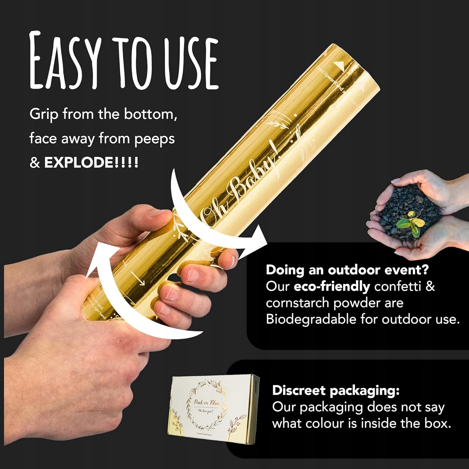 - Простий у використанні - будь-яка стать, що розкриває гармати, проста у використанні. Просто нанесіть, закрутіть і стріляйте, щоб звільнити живий конфетті та порошковий дим.