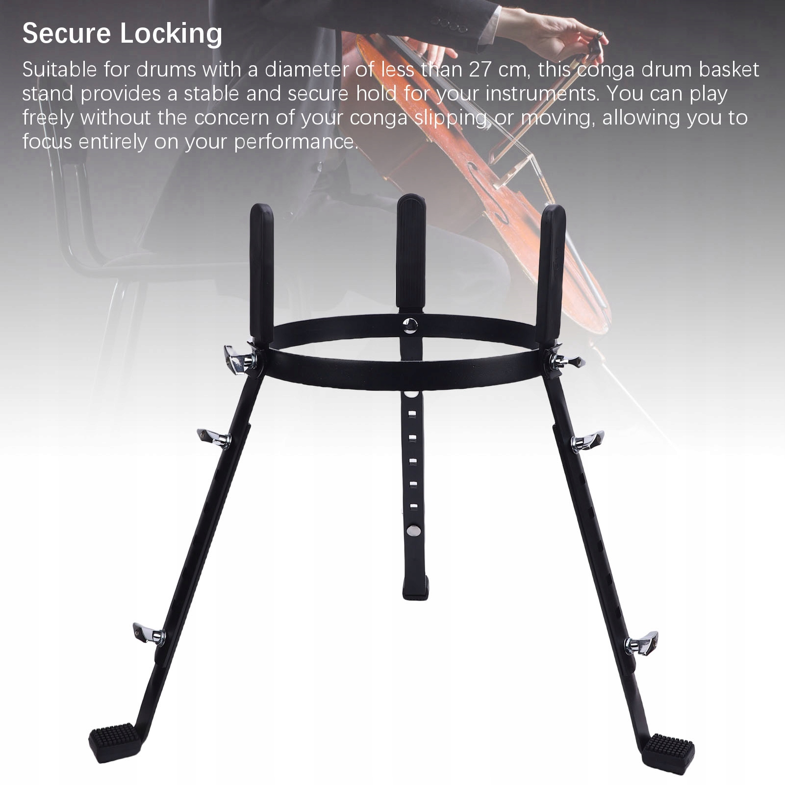 4. Безпечне блокування: підходить для барабанів з діаметром менше 27 см, ця конга -барабанна підставка забезпечує стабільну та безпечну підтримку ваших інструментів. Ви можете вільно грати, не турбуючись про ковзання або переміщення, що дозволяє зосередитись на ефективності.