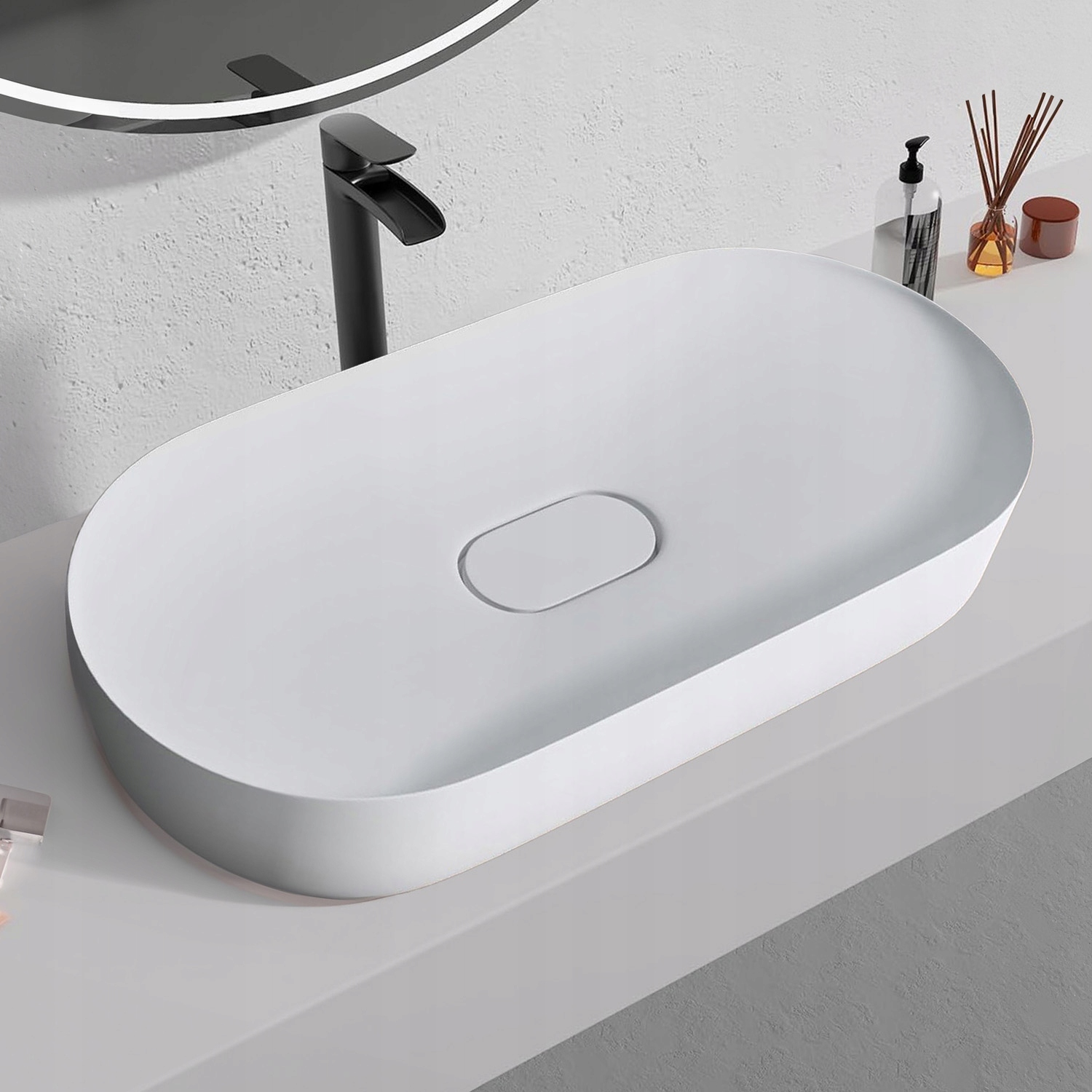 ☑️ Умивальник на стільницю з білого конгломерату – елегантний елемент сучасної сантехніки. Його округла овальна форма надає інтер’єру витонченої, органічної естетики, а глянсове глибоке біле покриття підкреслює його мінімалістичний і розкішний характер. Гладку поверхню конгломерату легко підтримувати в чистоті.