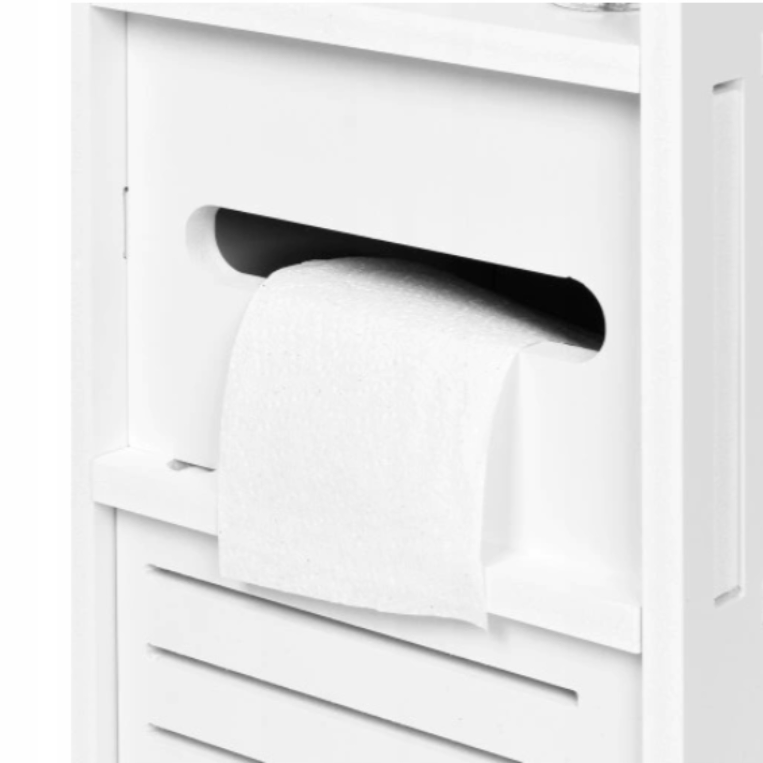 Верхня частина меблів була розроблена як практична годівниця для туалетного паперу - просто просуньте рулон, і він готовий. Нижче наведено закрите місце для зберігання з вентиляційним переднім , ідеально підходить для запасних роликів, очищення продуктів або інших дрібничок.