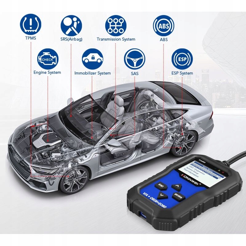 Konnwei KW350підходить для більшості автомобілів VW/Audi/Skoda/Seatв наявності на ринку. Основні функції діагностика включає читання та видалення кодів помилок різні системи, відображення даних у реальному часі, вимкнення індикатора MIL і читання даних ідентифікація автомобіля.