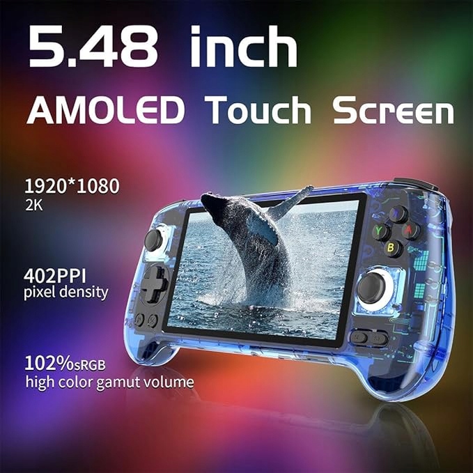 Він має HD-екран, 5,48-дюймовий AM OLED-екран із роздільною здатністю 1080*1920 пікселів, який забезпечує тонкий і зручний екран. використання інтегрованої сенсорної технології для більшої чутливості дотику. Retro Gaming Handheld компактний і легкий, його легко носити з собою і дозволяє грати в будь-який час і в будь-якому місці.