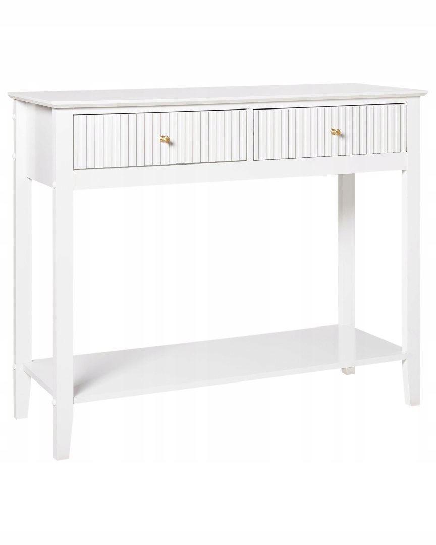 Цей стильний консольний столик є ідеальним доповненням до будь-якої вітальні чи спальні. Його простий зовнішній вигляд додає елегантності будь-якому інтер'єру, а міцна конструкція з МДФ забезпечує стабільність. Комод має 2 шухляди з елегантними золотистими ручками та одну полицю, що забезпечує додаткове місце для зберігання. Універсальний, нейтральний колір комода дозволяє підходити до багатьох стилів інтер'єру.