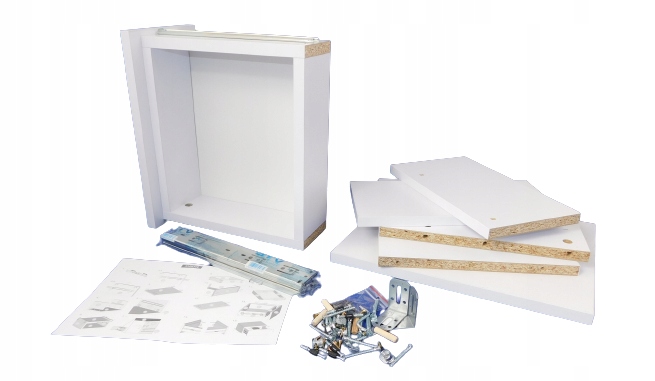 Шафа виготовлена з міцного ламінованого картону товщиною 18 мм. Ця дошка характеризується довговічністю та міцністю. Шафа виготовлена з більш товстої дошки, що робить шафу більшдовговічним і стійкішим. Матове покриття полегшує утримання меблів у чистоті. Шафа покрита ПВХ товщиною 0,8. Ящики оснащені направляючими від відомої на столярному ринку фірми GTV ball bearing full extension, яка користується хорошою репутацією. Ящик відкривається до самого кінця, що полегшує доступ до захованих у ньому речей. Ззаду встановлені металеві кутові кронштейни, які видно лише тоді, коли шухляда висунута, тому вона ідеально прилягає до стіни.