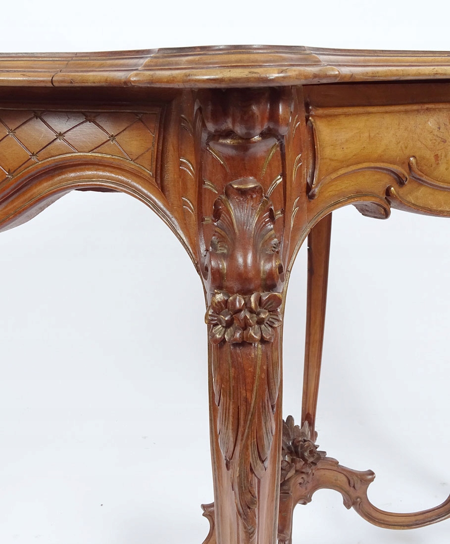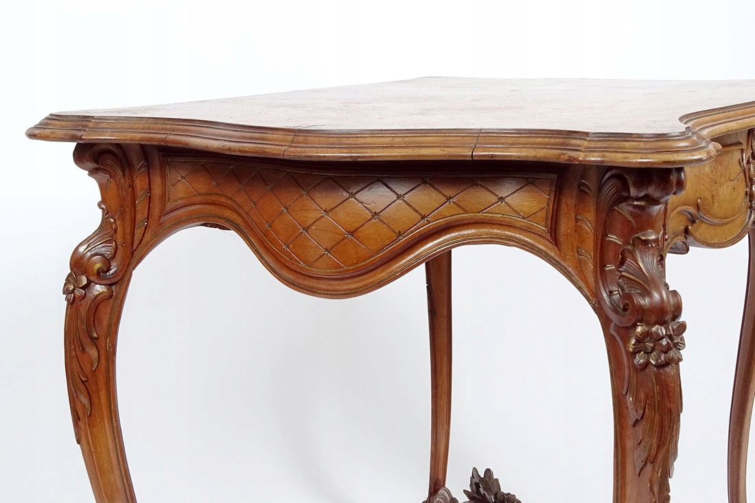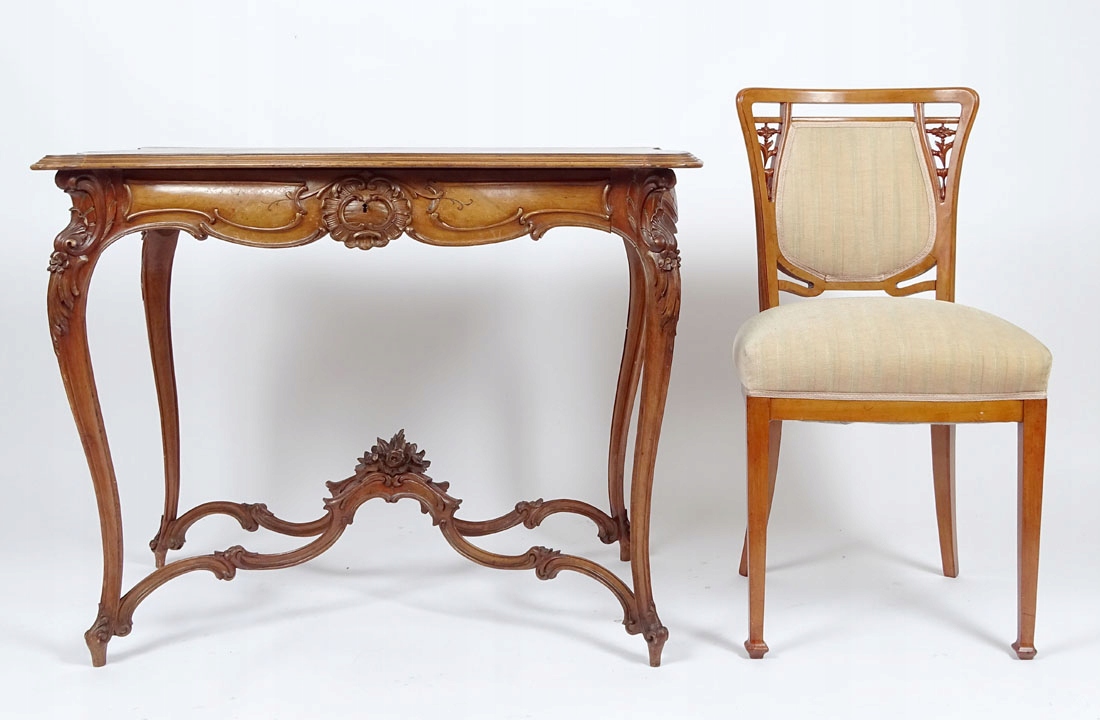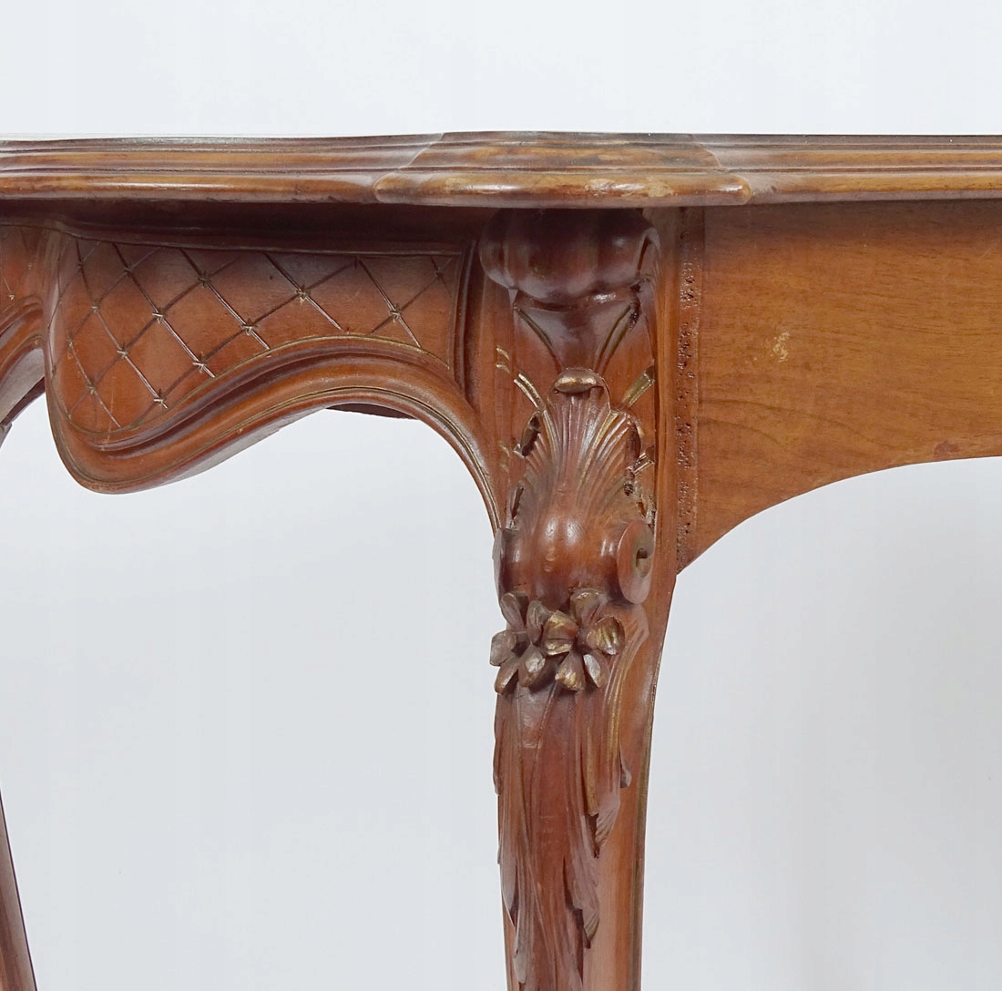 з вигнутою лінією рами, що спирається на чотири S-подібні ніжки з витонченими ніжками. Стільниця зі ступінчастою планкою по краю, оточена широким каркасом, з косим шпоном. У корпусі знаходиться ящик з вигнутою гранню, з різьбленням у вигляді черепашок і вусиків рослин, зі сталевим врізним замком. Боги опуклі, з різьбленням у формі ніжних ромбів. Ніжки, що трохи виступають за межі меблів, прикрашені рослинними мотивами, скріплені знизу профільованим хрестом, увінчані тонкими листочками з дрібними квіточками.