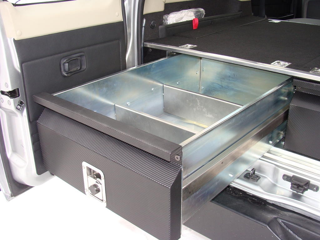 Кожна шухляда оснащена двома перегородками, які можна знімати залежно від ваших потреб. Фронтальні панелі покриті порошковою фарбою античного срібла, що додає естетики всьому. Обидва ящики оснащені міцними замками з нержавіючої сталі, які можна закрити на ключ. Верхня частина виготовлена з фанери, обтягнутої повстю, закріпленої по краях алюмінієвим куточком, завдяки чому все гарно вписується в салон автомобіля та є приємним у використанні.
