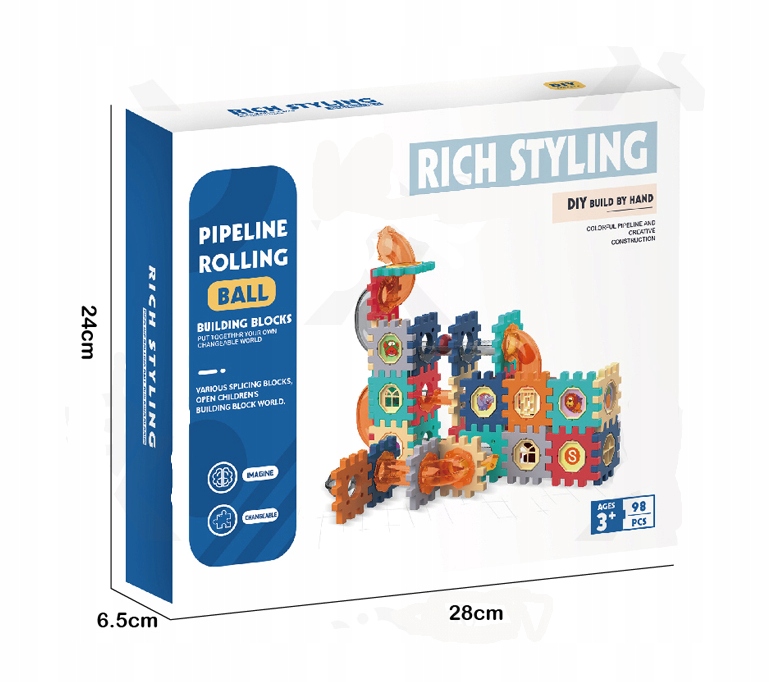 - Набір входить: тунелі, наклейки, блоки, плитки, гірки, кульки, доріжки для кульок, інструкції