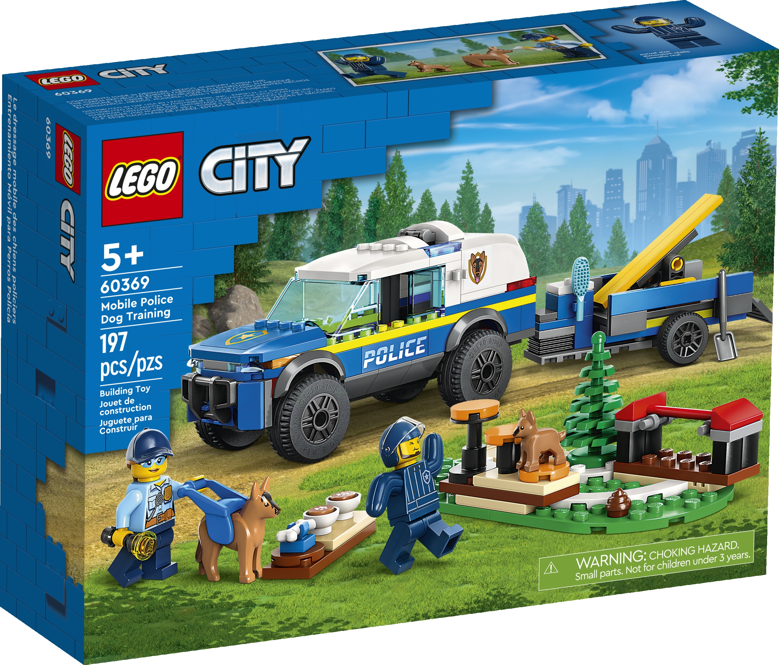 Дітям і любителям собак віком від п’яти років сподобається LEGO® City Off-Road Police Dog Training (60369) комплект. У нього входить позашляховик K9, причіп і три аксесуари для дресирування собак, включаючи балансир, перешкоди та сходинки. Просто додайте поліцейських і собак, і ви готові до гри.