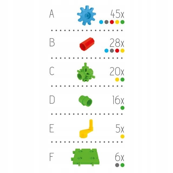 Набір складається зі 120 шт. елементи , з яких можна створити декілька конструкцій. До їх складу входять шестерні та кривошипи, які дозволяють приводити конструкцію в рух.