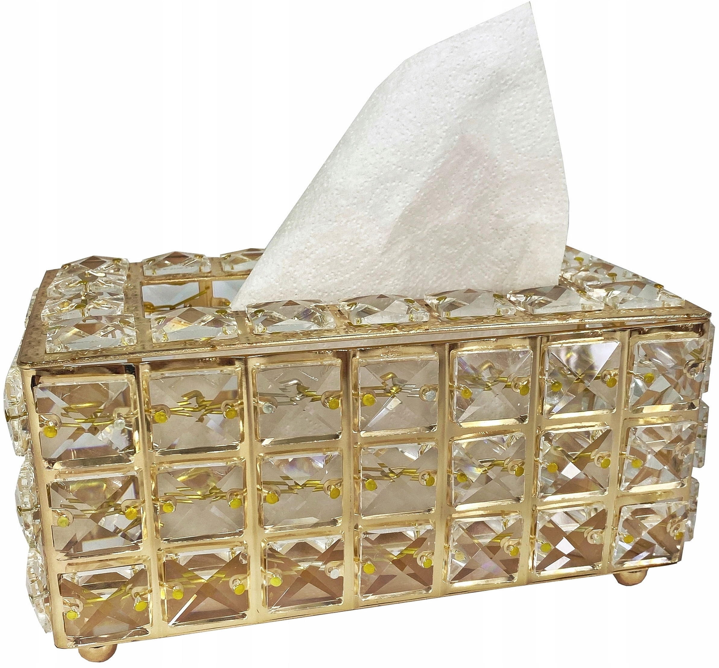 Коробка для серветок із кристалами з боків і зверху. Дно контейнера металеве, оброблене чотирма круглими підніжками. Отвір прямокутний.