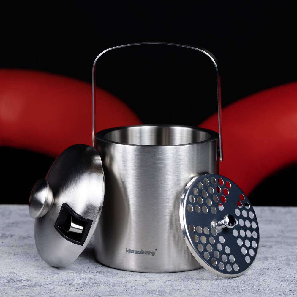 Набір відерця для льоду з нержавіючої сталі підійде не тільки в барі, а й вдома. Контейнер для льоду має структуру, яка забезпечує хорошу теплоізоляцію, тому кубики довше залишатимуться в потрібному стані. У кришці відра є щипці для льоду. Ви можете сховати їх там і зберігати абсолютно гігієнічно. Відро для льоду також має ручку для зручного перенесення. Вся конструкція срібляста з сатиновим покриттям