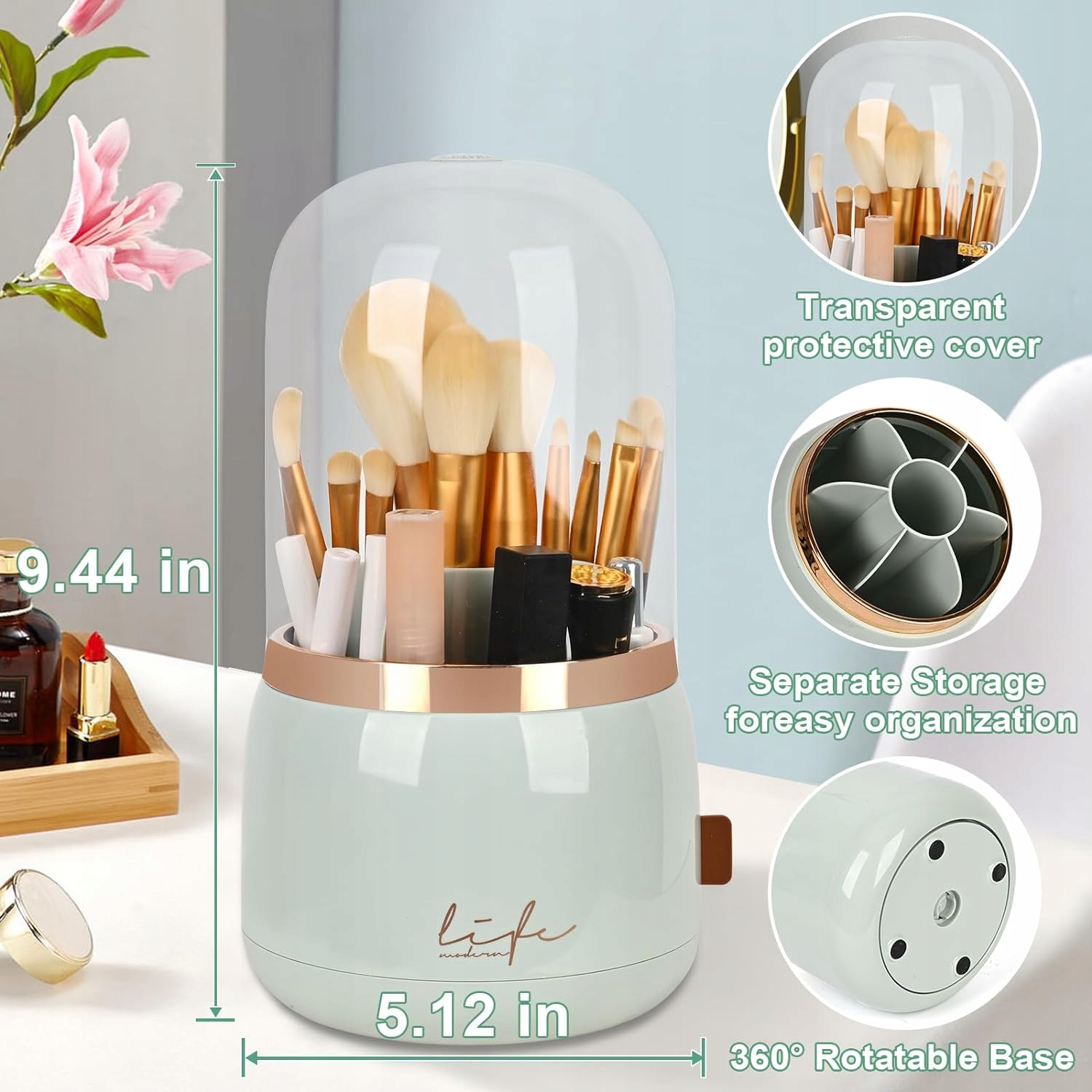 , оснащений практичною елегантною кришкою, Цей організатор додатково захищає вашу косметику від пилу, вологи та інших домішок. Завдяки цьому ви можете бути впевнені, що ваша косметика залишатиметься свіжими і тривалий час зберігає ваші властивості.