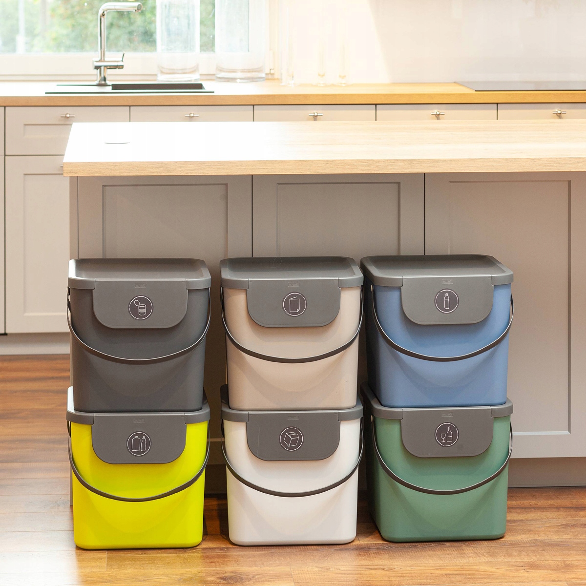 Завдяки добре продуманій системі утилізації відходів Rotho ви можете з першого погляду побачити, до якого контейнера вони потрапляють. Це забезпечується наклейками на передній частині кришки з різноманітними принтами. Лише один погляд на сміттєвий бак і ви знаєте, куди подіти ПЕТ-пляшки або до якого контейнера скляні пляшки чи папір. ALBULA виготовлена з переробленого пластику та вражає надійністю виготовлення. Індивідуальні відра мають місткість 40 л. Завдяки кришці контейнери для сміття Rotho легко закриваються. Продукт Rotho ідеально підходить для кухні, ванної кімнати, офісу тощо.