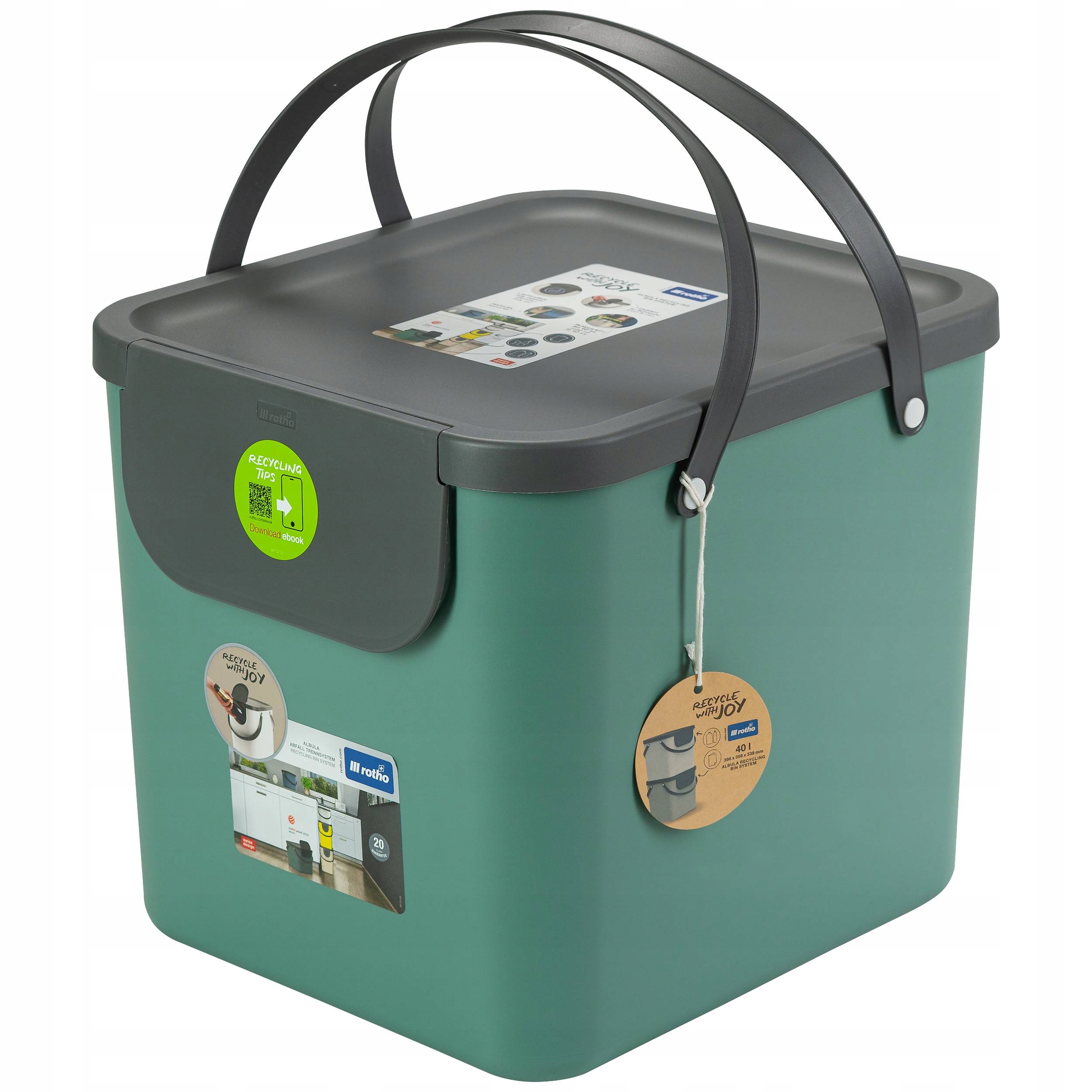 Завдяки добре продуманій системі утилізації відходів Rotho ви можете з першого погляду побачити, до якого контейнера вони потрапляють. Це забезпечується наклейками на передній частині кришки з різноманітними принтами. Лише один погляд на сміттєвий бак і ви знаєте, куди подіти ПЕТ-пляшки або до якого контейнера скляні пляшки чи папір. ALBULA виготовлена з переробленого пластику та вражає надійністю виготовлення. Індивідуальні відра мають місткість 40 л. Завдяки кришці контейнери для сміття Rotho легко закриваються. Продукт Rotho ідеально підходить для кухні, ванної кімнати, офісу тощо.