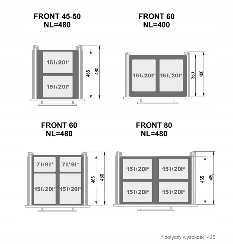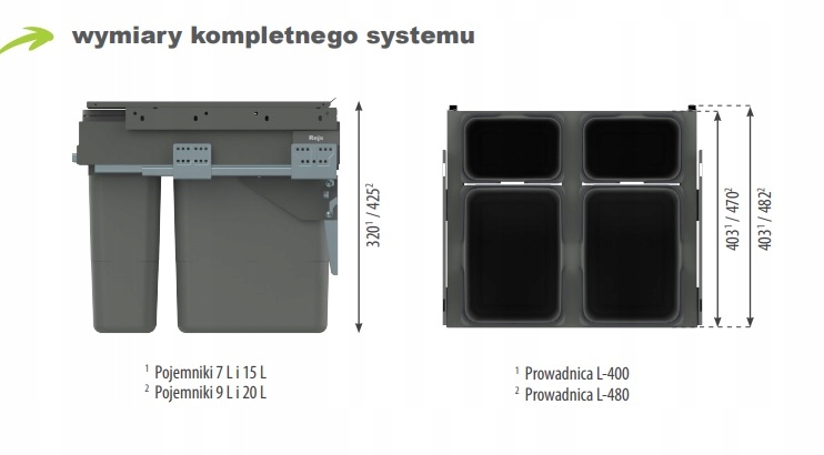 для шаф з шириною 450 мм - 500 мм та глибиною 480 мм - набір з 2 сміттєзвалища про ємність 15 літрів (висота 320 мм), набір з 2 контейнерів потужністю 20 літрів (висота 425 мм;