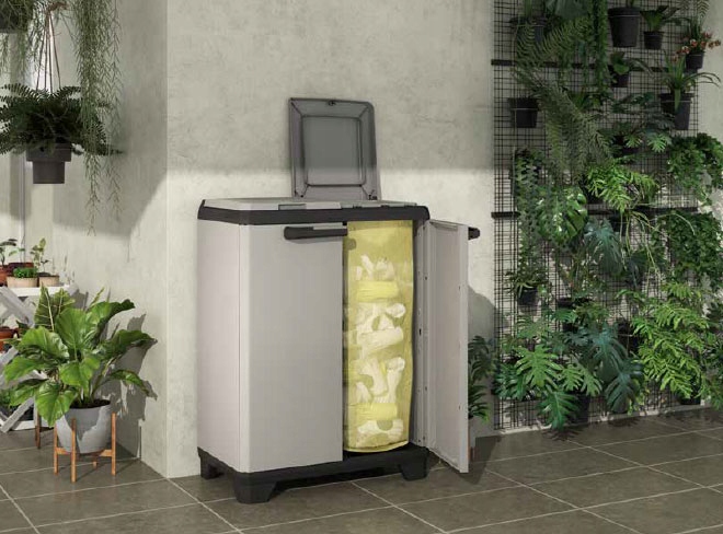 шафи та відсіки для зберігання з колекції планет мають мінімалістичний вигляд та нейтральні кольори. Кабінет сегрегації ефективно ховає непривабливі мішки зі сміттям і дозволить вам зберігати порядок вдома або в саду.