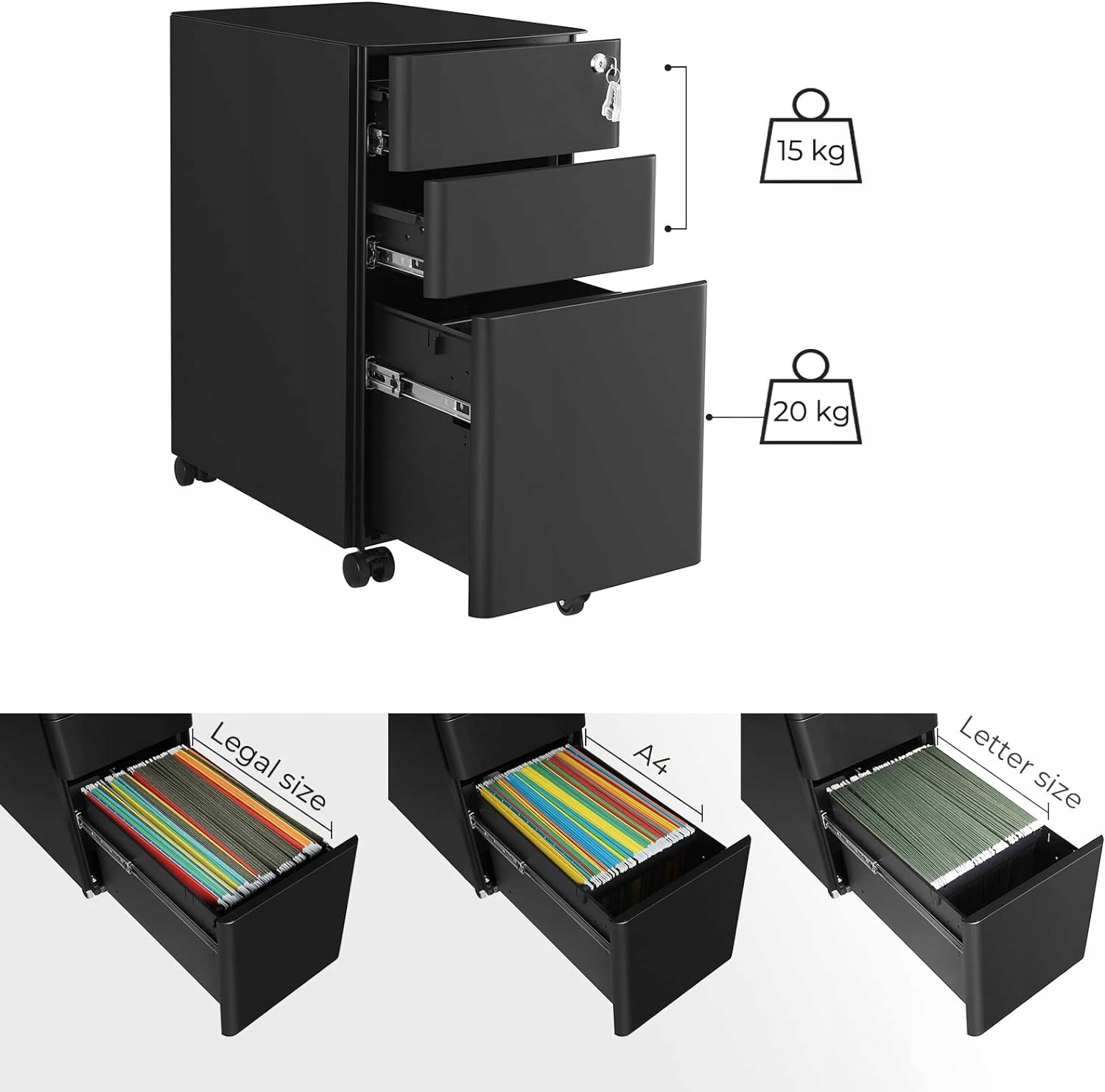 SONGMICS Контейнер на коліщатках, картотека, офісна шафа на коліщатках, письмовий стіл, замикається, ящики, документи формату DIN A4, legal, letter, висить реєстр, чорний