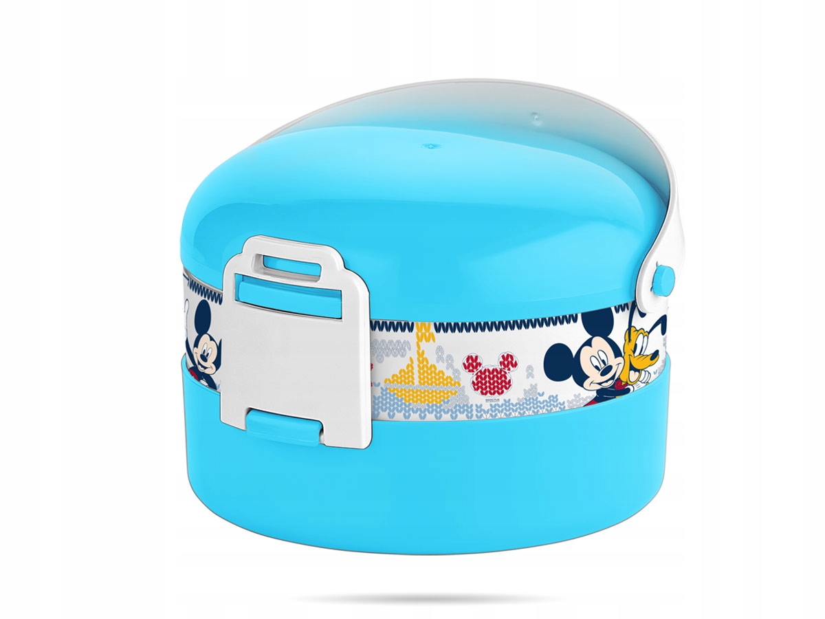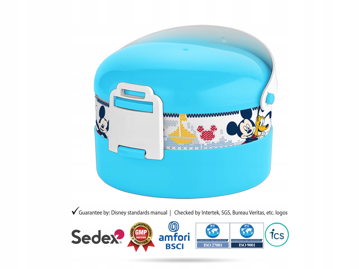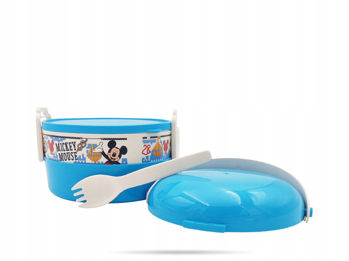 Синій контейнер із офіційним мотивом Діснея Міккі Мауса має два рівні, які дозволяють розділяти їжу на вибрані групи чи порції. Нижня частина ящика, яка є одним з двох контейнерів, має відділення. Друга частина, яка становить другу ємність, закривається додатковою кришкою, яка додатково захищає страву.