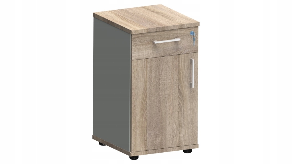 Земля -контейнер з ключовим ящиком Silva, виготовленим з меблів, покритих мебловими меблами. Верхній і нижній вінок, виготовлений з 22 мм тарілки, тіла та передньої частини 18 мм тарілки. Контейнер має металеві роликові путівники та ключовий ящик. Одна внутрішня полиця в нижній частині. Контейнер на ногах. Контейнер доступний у лівій версії (нижні передні петлі зліва, ручка праворуч) та права (нижні передні петлі праворуч, ручка зліва) . Поруч з лівим контейнером. Ми можемо приховати документи або офісні предмети в контейнері, які не повинні постійно займатися місцем на столі, і завжди буде "під рукою". модулів меблів, завдяки якому ви можете розробити обстановку меблів у кімнатах з невеликим або великим офісним приміщенням.