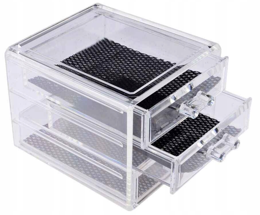 Практичний органайзер для косметики, аксесуарів та прикрас різного розміру, виготовлений з більш щільного прозорого акрилу. Має 3 висувних ящика, завдяки яким можна легко і практично розмістити косметику або прикраси.