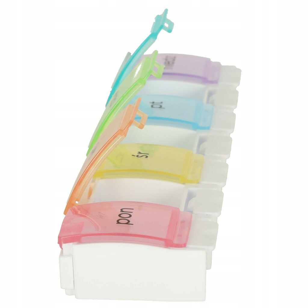 Кожне відділення позначено польською мовою, а кожному дню тижня присвоєно інший колір. Розміщення таблеток у щотижневих упаковках полегшить їх регулярний прийом!