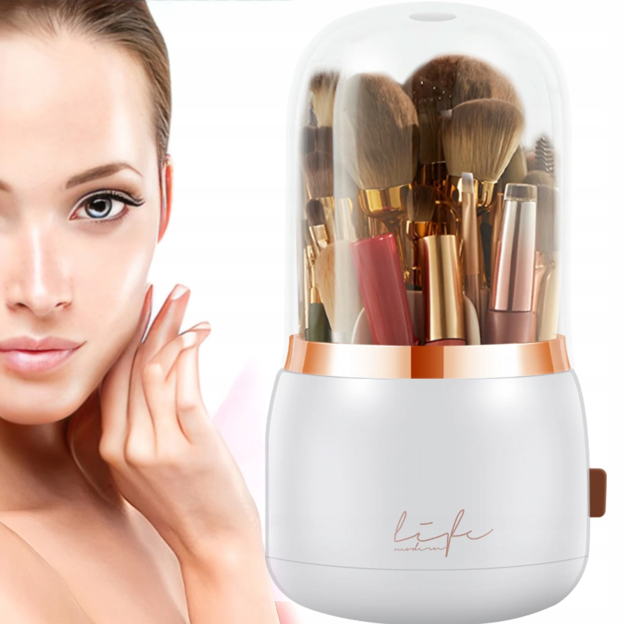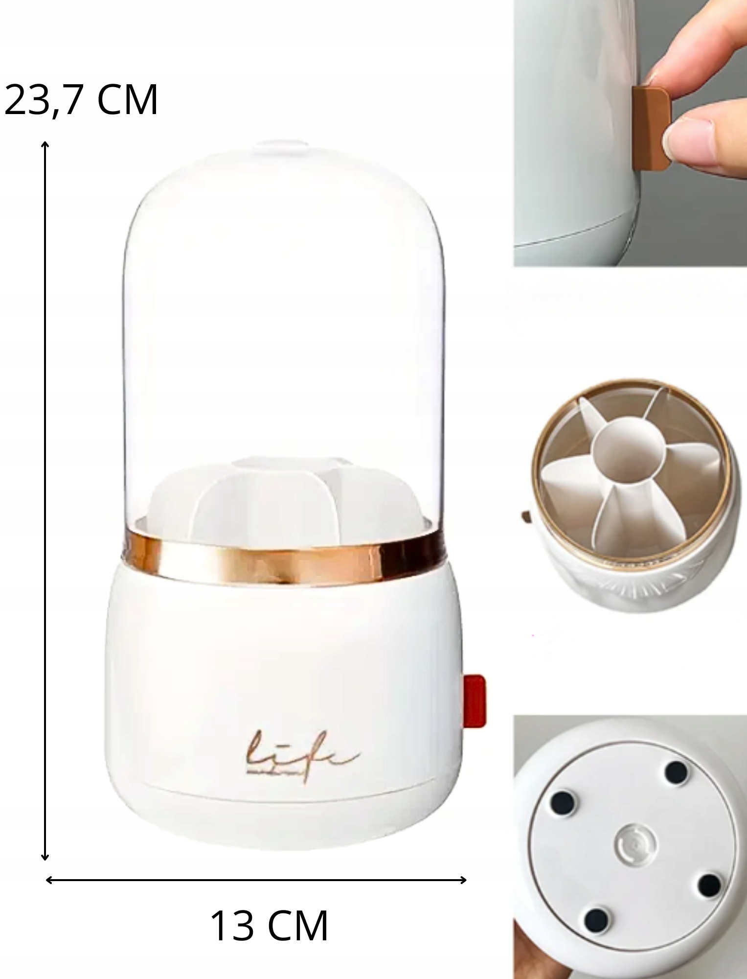 Високоякісний поворотний органайзер для пензликів білого кольору. Це допоможе вам тримати ваші пензлики або маленькі косметичні засоби акуратними та чистими, завдяки обертовій системі ви легко знайдете те, що шукаєте, а відділення допоможуть вам упорядкувати менші та великі речі. Органайзер закритий, що робить його водонепроникним, а його елегантний зовнішній вигляд зробить його стильною прикрасою у вашому домі!