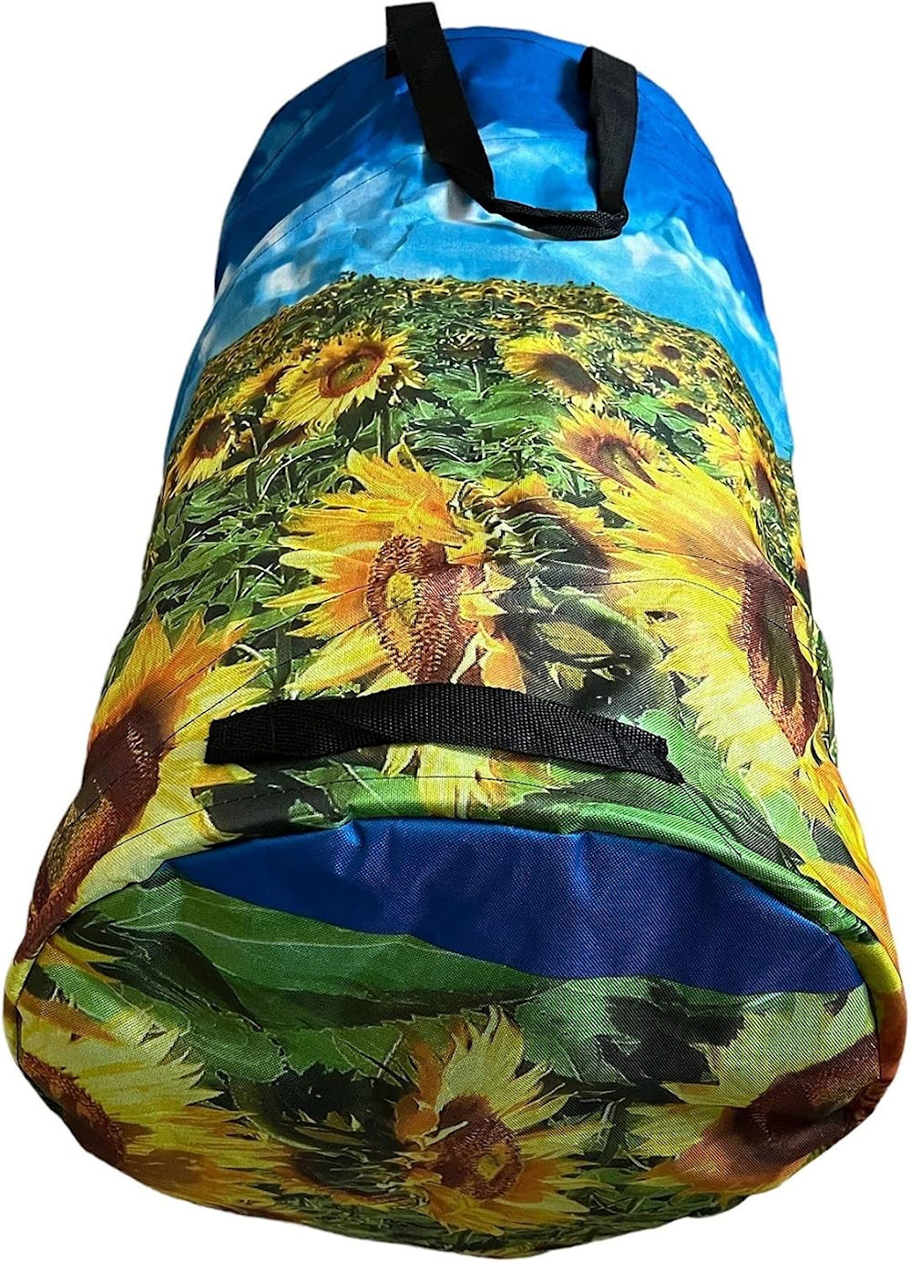 Кошик прикрашений мотивом лугу, повного соняшників, тому навіть під час роботи в саду він виглядає елегантно порівняно зі стандартними пакетами для сміття.