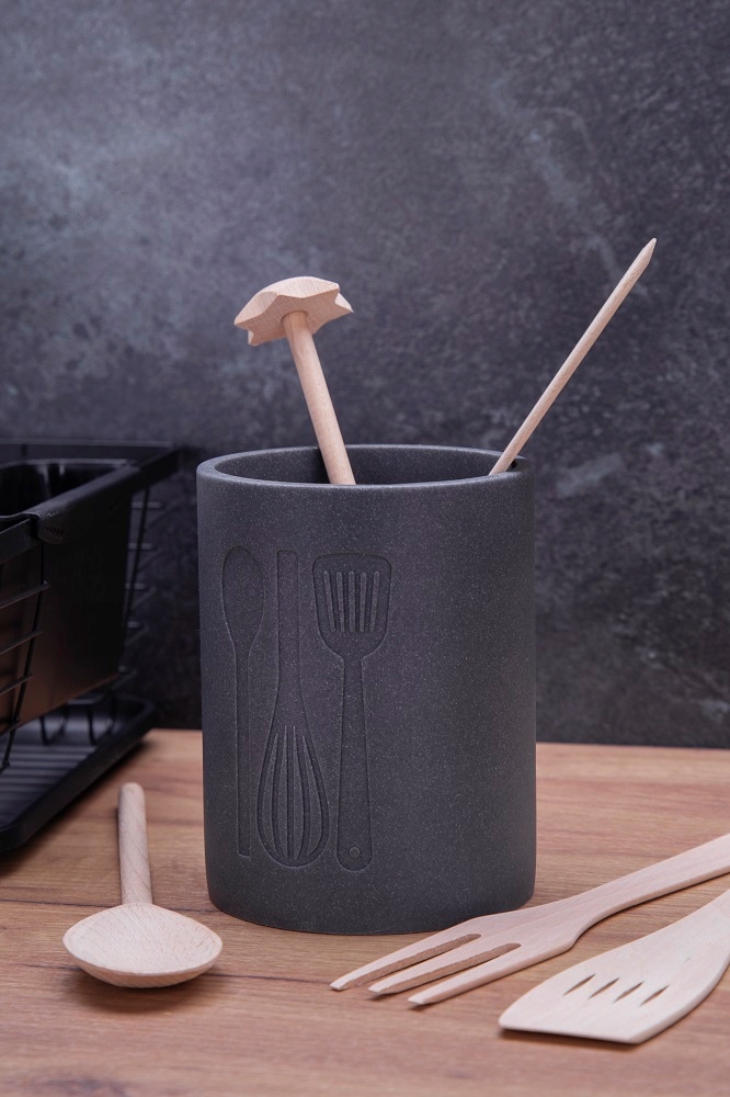 Представлені аксесуари для кухні SANDY не тільки дизайнерські, але й дуже практичні. Ящик для інструментів має класичну, круглу форму. У нього підійдуть усі ложки, черпаки та лопатки, які варто завжди мати під рукою під час приготування їжі. Ящик для інструментів із сірого каменю також важкий, тому він стабільно лежить на кухонній стільниці. Цікаветиснення у формі кухонного начиннядодає йому шарму.