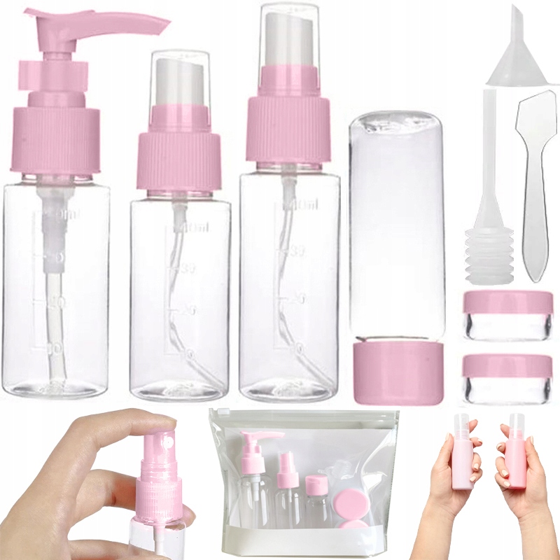 Дорожній набір із 9 предметів — ідеальне рішення для кожного мандрівника. Контейнери ідеально підходять для подорожей літаком і автомобілем. Резервуари для рідин і кремів знаходяться в межах місткості авіакомпанії. Контейнери - відмінне рішення для жінок, які самостійно готують косметику вдома. Косметичка виготовлена з водонепроникного матеріалу на блискавці.
