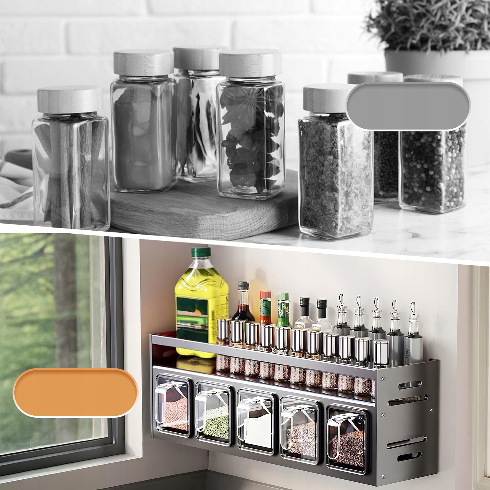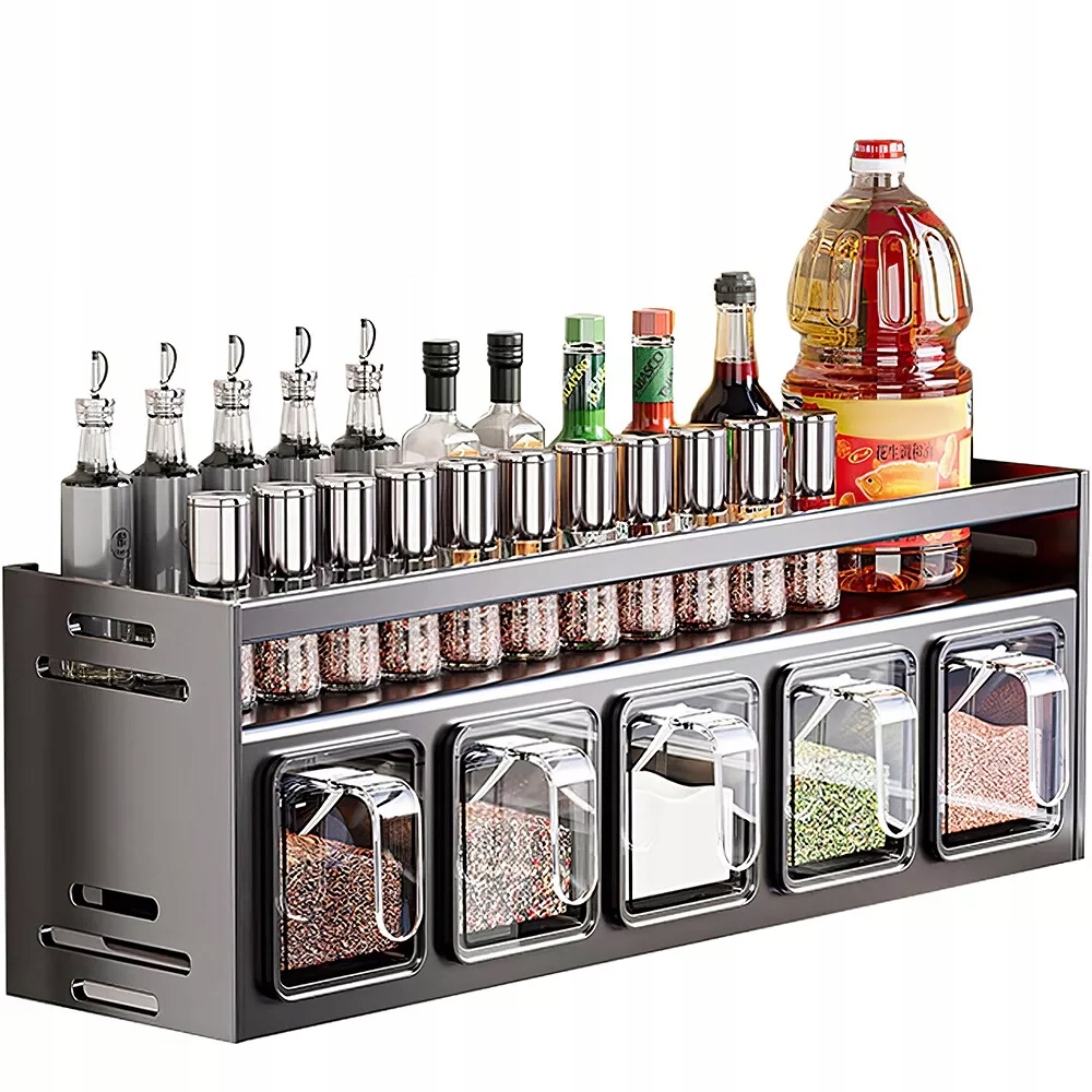 1. Високоякісні матеріали: Полиця для спецій виготовлена з високоякісного алюмінію, має стійку конструкцію, міцна та довговічна, стійка до корозії та іржі. Ємність для спецій виготовлена з безпечного для харчових продуктів поліпропіленового пластику, який не має запаху, міцний і безпечний. Прозорий контейнер для спецій дозволяє легко ідентифікувати спеції та зберігати їх. Стійка для спецій ідеально підходить для зберігання спецій, цукру, солі, зерна, перцю та інших спецій.