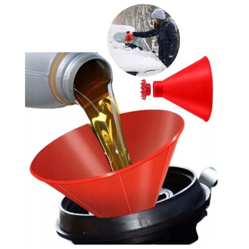 Завдяки інноваційній конструкції 2-в-1 наша воронка не тільки дозволяє легко та точно додавати паливо або масло, але також має вбудований скребок, ідеальний для для видалення льоду зі стекол автомобіля.