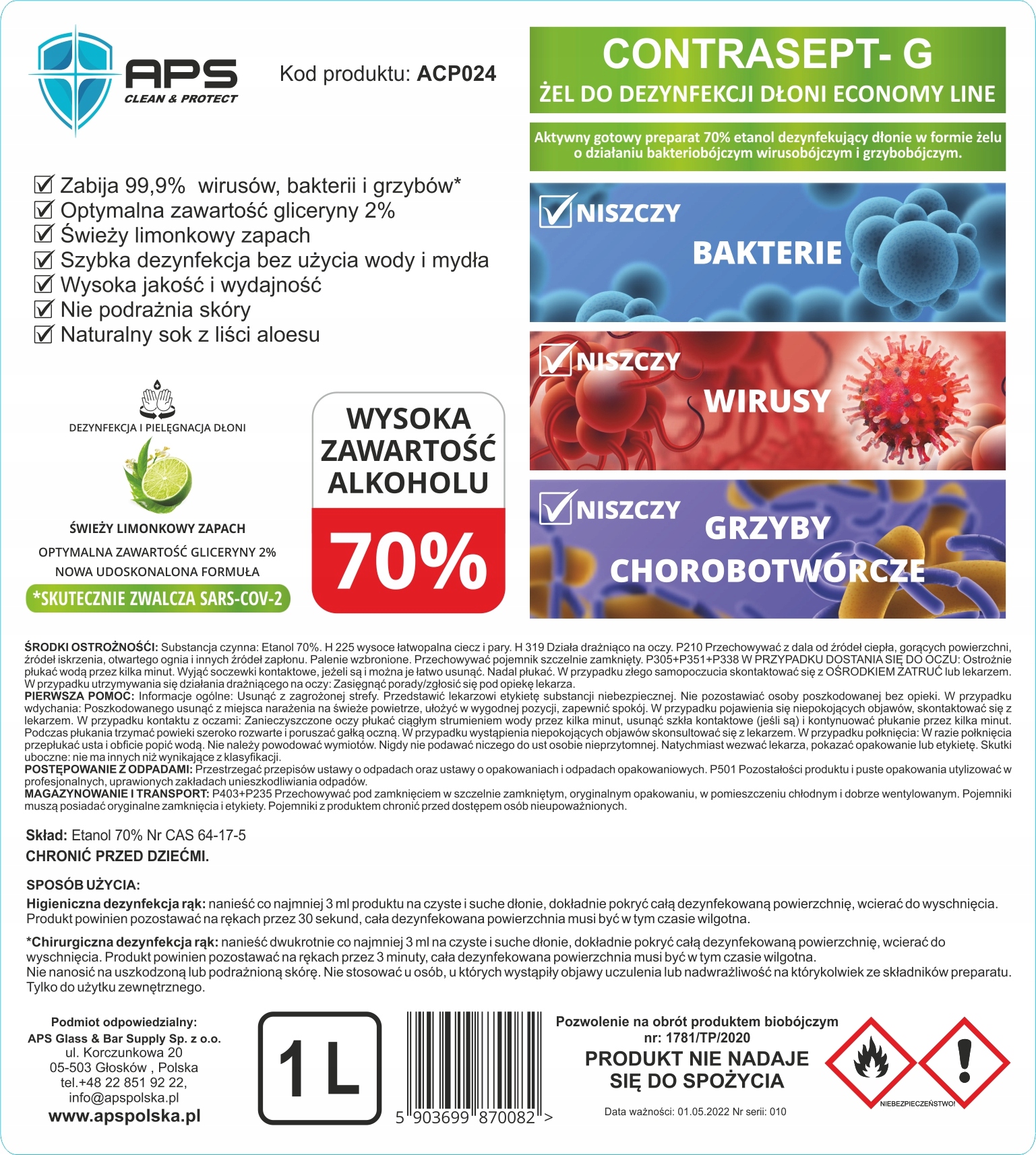 Антибактеріальний гель для рук з бактерицидними, віруліцидними та фунгіцидними властивостями, призначений для гігієнічної дезінфекції рук без використання води. Містить 70% етанолу.