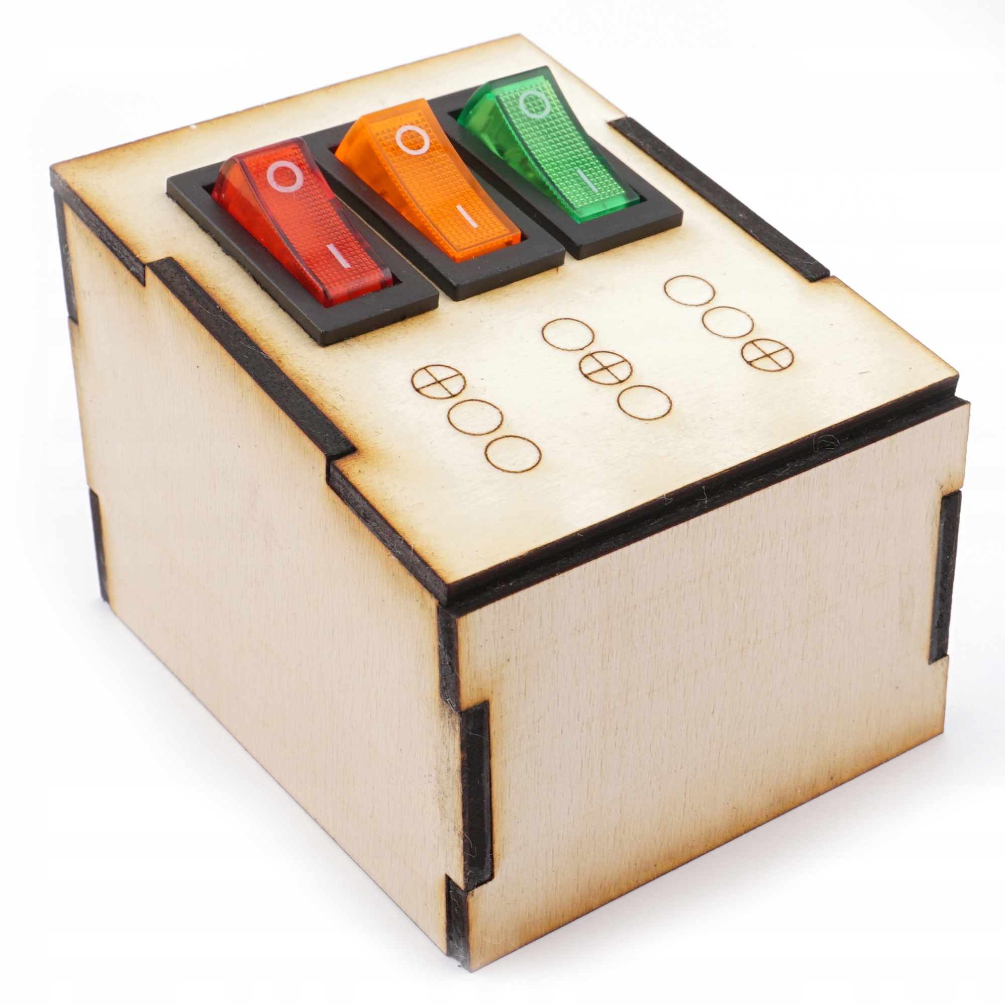Представляємо вам наш продукт. Управління 3-х камерним семафором з акуратного робочого столу з фанери 3 мм. Набір призначений для самостійного збирання, але рівень складності обмежений до мінімуму, тому навіть у «електрика» не виникне проблем зі зборкою цього набору. Крім того, складання спрощується завдяки інструкціям, що входять у комплект. Комплект не вимагає пайки! Ми підключаємо все за допомогою швидких роз’ємів.