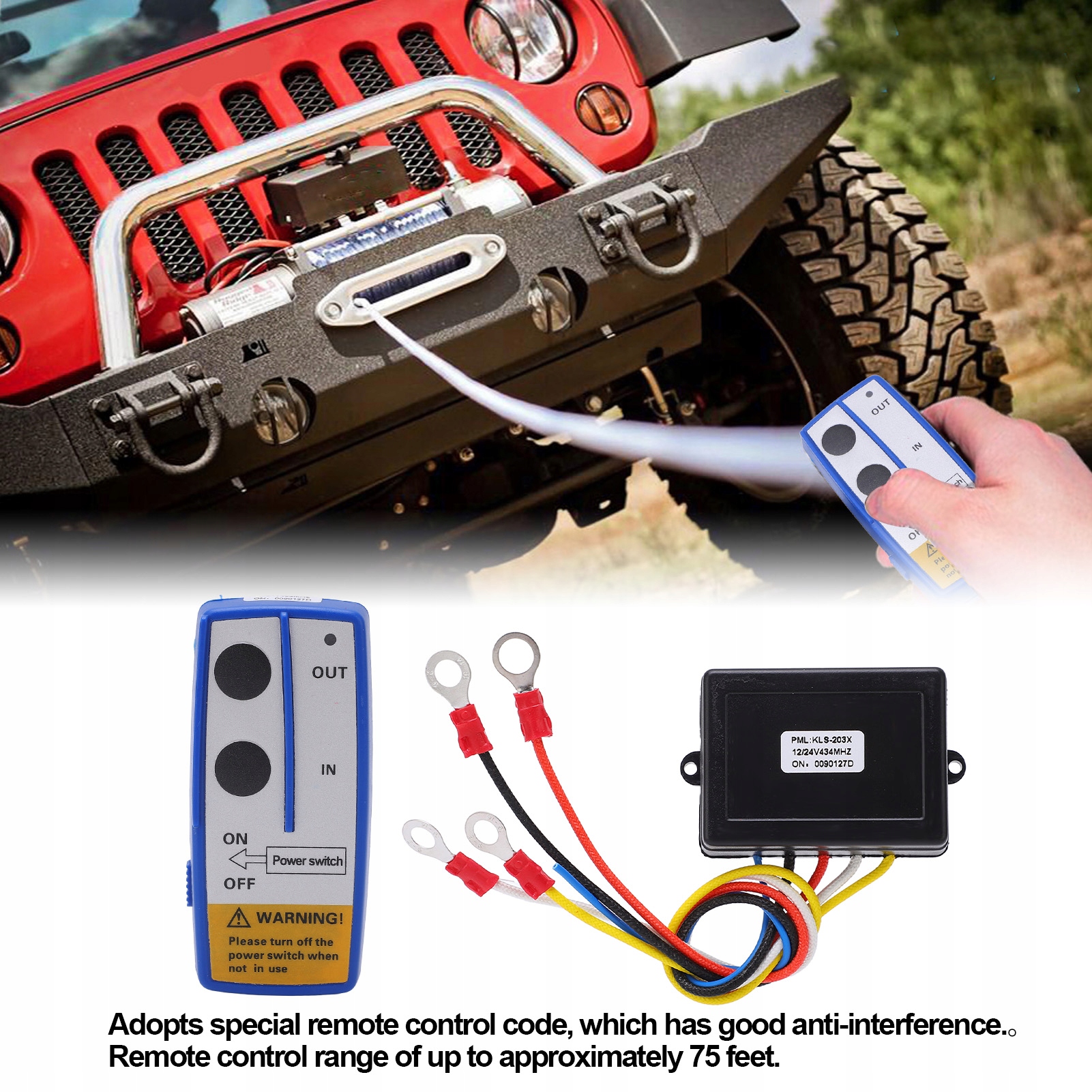 Особливості: 1. Перевага: комплект дистанційного керування лебідкою використовує спеціальний код дистанційного керування, який має хорошу ефективність захисту від заклинювання. Діапазон дистанційного керування приблизно до 75 футів.