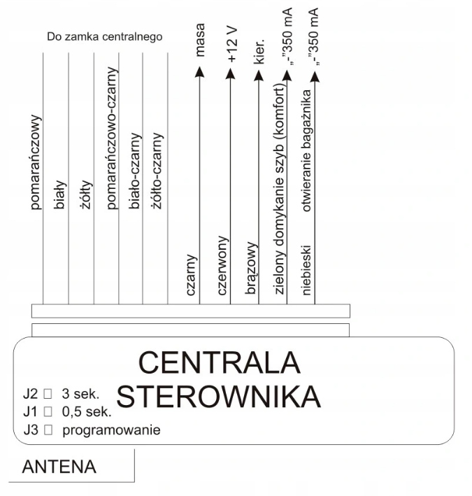 - Програмування пультів дистанційного керування: Натисніть і утримуйте кнопку J3, доки покажчики повороту не засвітяться постійно. У нас є 5 секунд, щоб закодувати пульт дистанційного керування. Кожне кодування пульта буде підтверджено миготінням покажчиків повороту. Система підтримує максимум 4 пульти дистанційного керування.