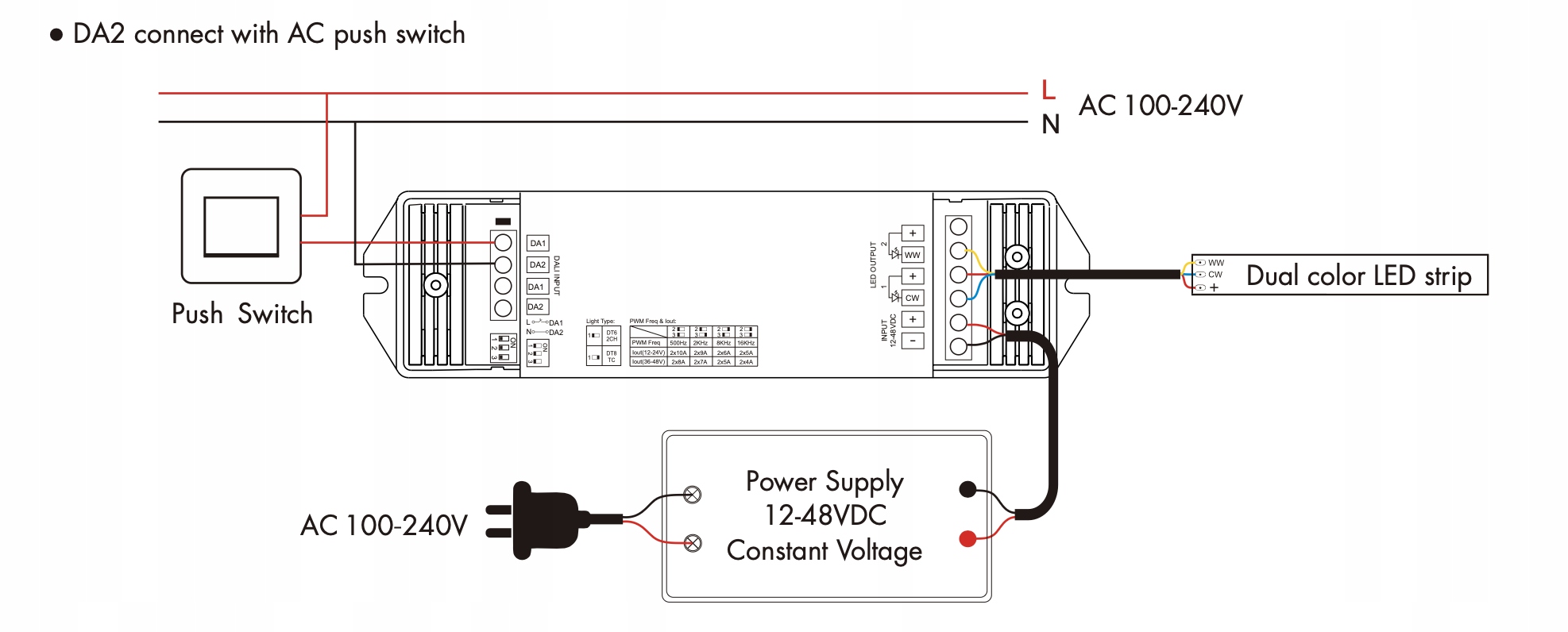 Контролер DA2 — це 2-канальний контролер, який забезпечує можливість керування монохромними та багатобілими (CCT) світлодіодними стрічками за допомогою протоколу DALI.