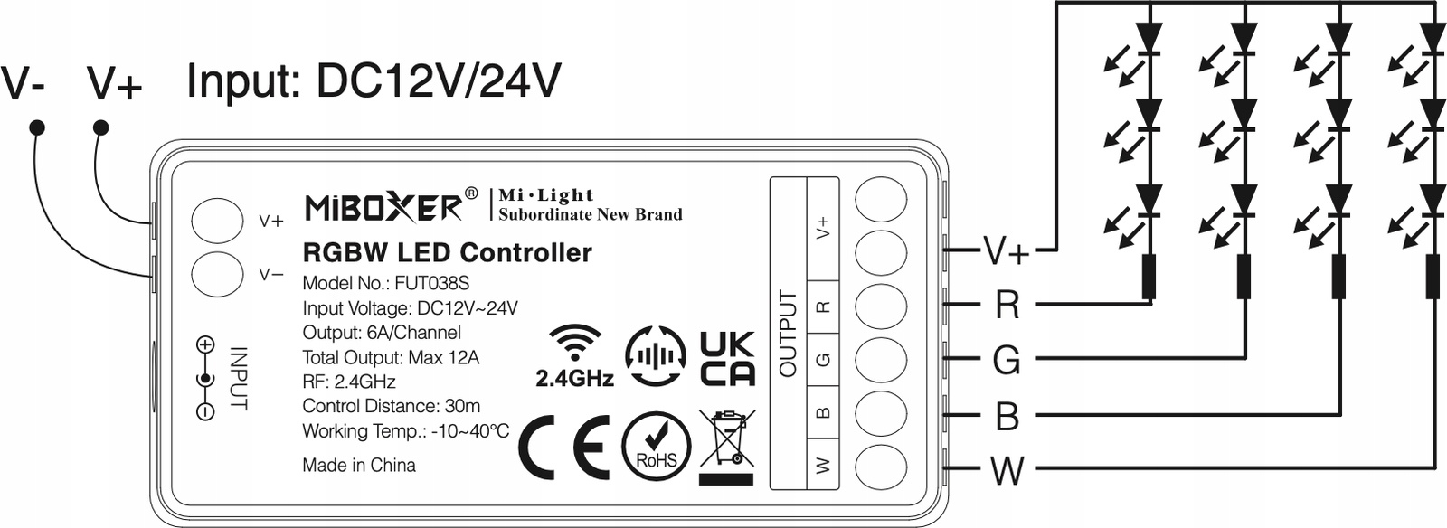 Контролер FUT038S розроблено для підтримки світлодіодних стрічок RGBW. Цей контролер не слід використовувати з іншими типами стрічок, оскільки це може призвести до його неправильної роботи. Завжди вибирайте правильний контролер для світлодіодної стрічки.