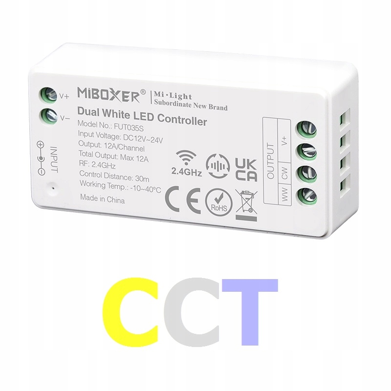Контролер FUT035S розроблено для підтримки світлодіодних стрічок CCT. Цей контролер не слід використовувати з іншими типами стрічок, оскільки це може призвести до його неправильної роботи. Завжди вибирайте правильний контролер для світлодіодної стрічки.