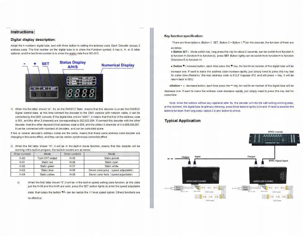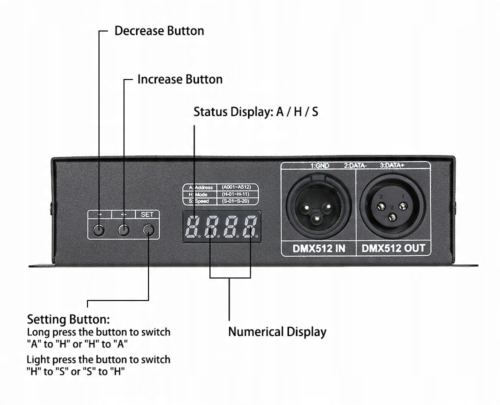 Ви можете натиснути кнопку "SET", щоб переключити статус відображення між "A", "H" і "S". «A» означає, що він входить до контролю стану сигналу декодера DMX512. «B» означає, що він переходить у статус шаблону вбудованого декодера. «S» означає, що він переходить у стан налаштування швидкості вбудованого декодера. Утримуйте кнопку, щоб перемкнути «A» на «H» або «H» на «A», і натисніть кнопку, щоб перемкнути освітлення «H» на «S» або «S» на «H». 20-ступінчастий режим регулювання швидкості можна активувати лише в режимах H-08, H-09, H-10 і H-11.