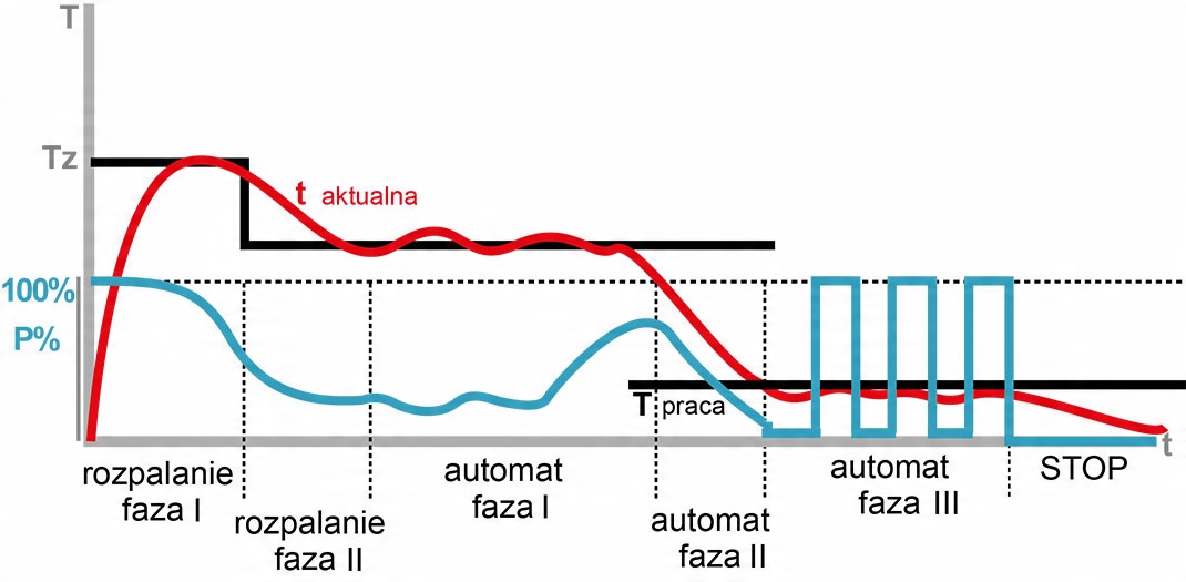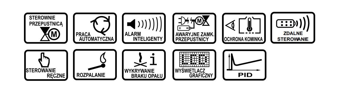 - автоматичне регулювання процесу горіння шляхом контролю надходження повітря в топку каміна з урахуванням показань температури вихлопних газів. Завдяки можливості контролювати потік повітря в камеру згоряння ми економимо паливо та зменшуємо викиди шкідливих речовин в атмосферу. На основі інформації про температуру відпрацьованих газів регулятор збільшує час горіння між наступними завантаженнями палива в топку. Підтримує температуру вихлопних газів на оптимальному рівні. Він закриває заслінку після закінчення копчення, що запобігає охолодженню каміна. Це стало можливим завдяки вдосконаленому алгоритму, реалізованому в контролері, розробленому групою інженерів з конструкторського бюро PLUM.