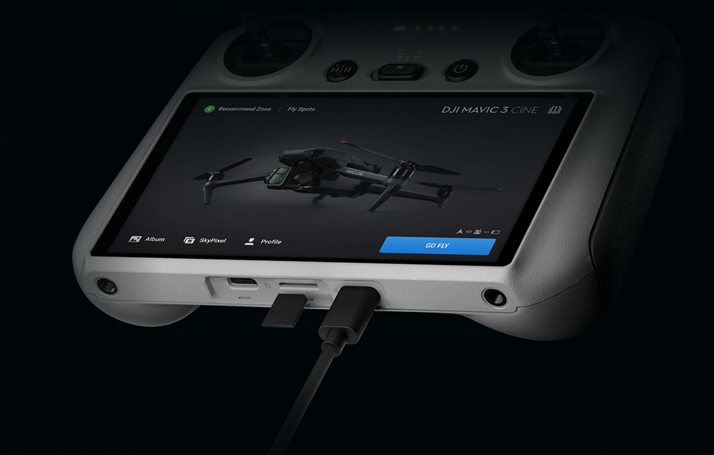 Отримайте додаткові можливості та полегшуйте себе створити вражаючий матеріал з пташиного погляду. DJI RC Control Aparatus пропонує кілька найпоширеніших портів, якими ви можете використовувати. USB -C -порт дозволяє йому зручно заряджати - використовуючи зарядку 5 v/3 a (або краще), він триватиме лише 1,5 години. також доступний слот для картки MicroSD, завдяки якому ви можете зручно зберігати свої фотографії та фільми.